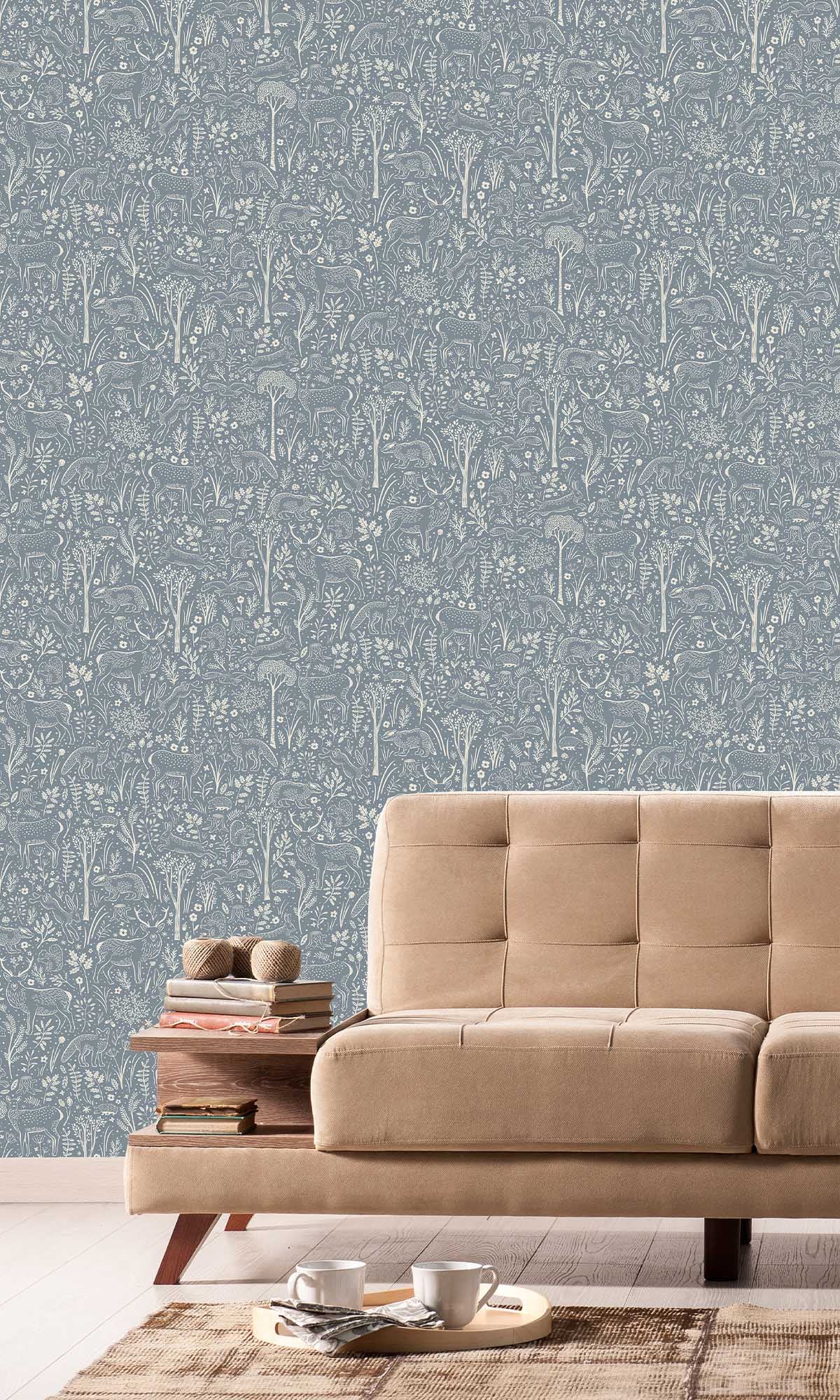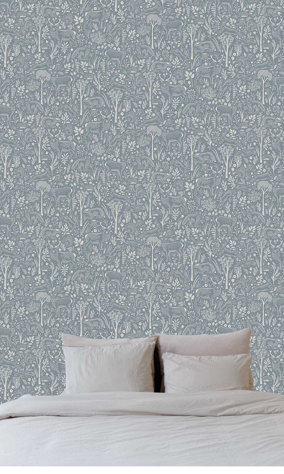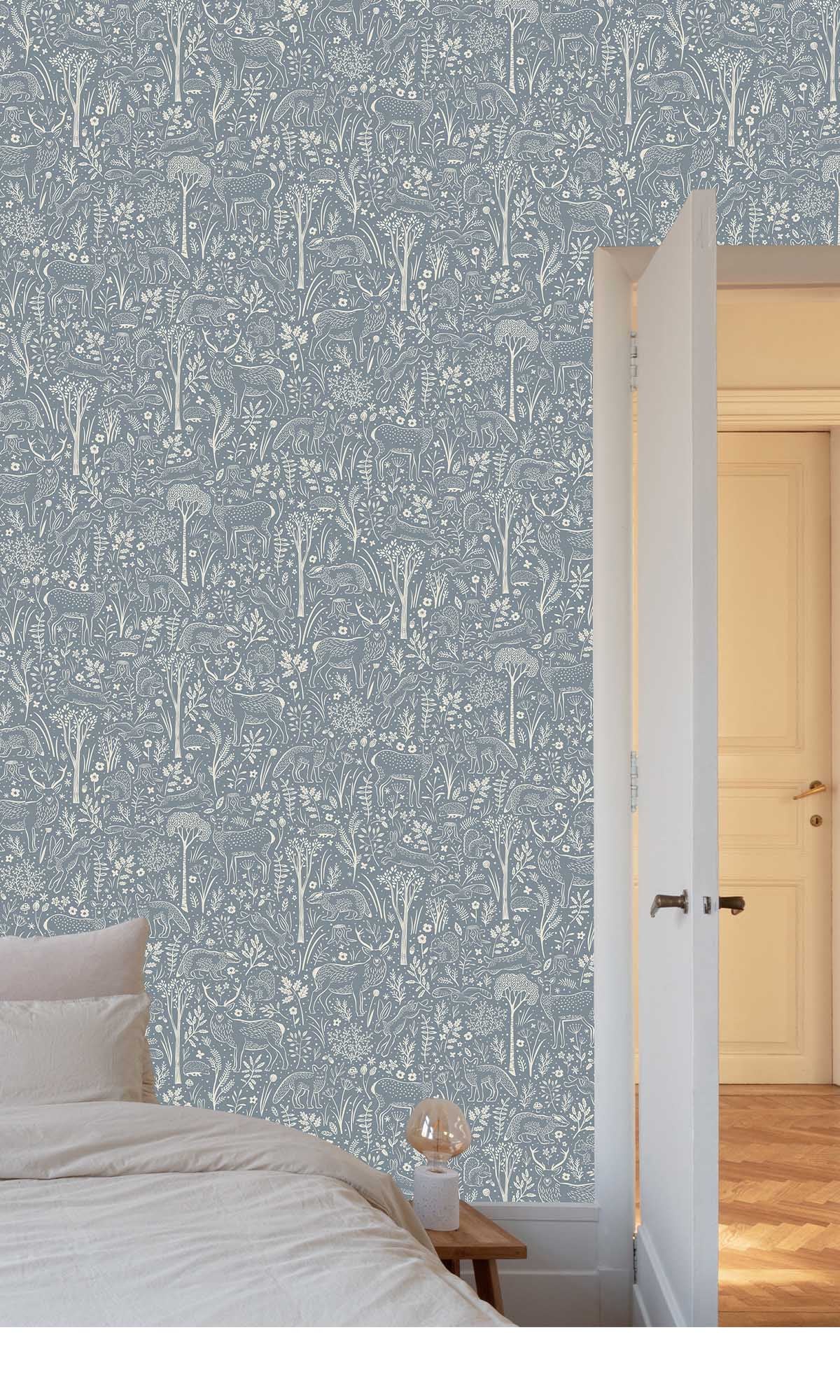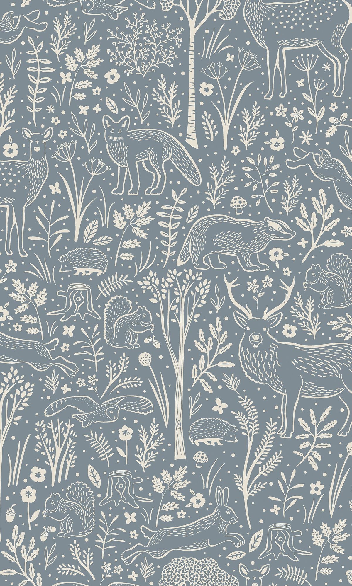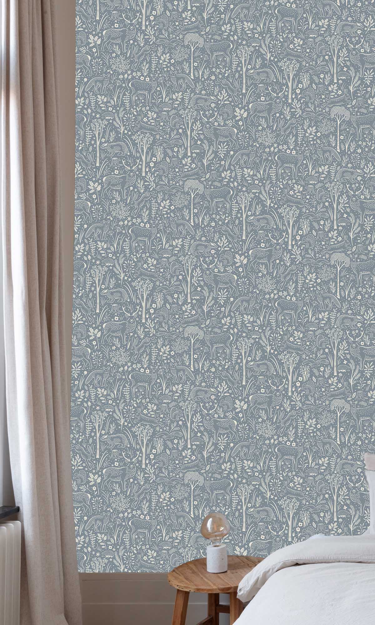 The pattern comes to life with intricate, tone-on-tone illustrations rendered in a gentle off-white shade. The result is a subtle, elegant contrast that feels airy, modern, and visually calming. The design is rich with delightful woodland details, including graceful deer, playful foxes, curious squirrels, nimble rabbits, hedgehogs, and badgers, all nestled among delicate trees, lush foliage, mushrooms, and soft floral accents.