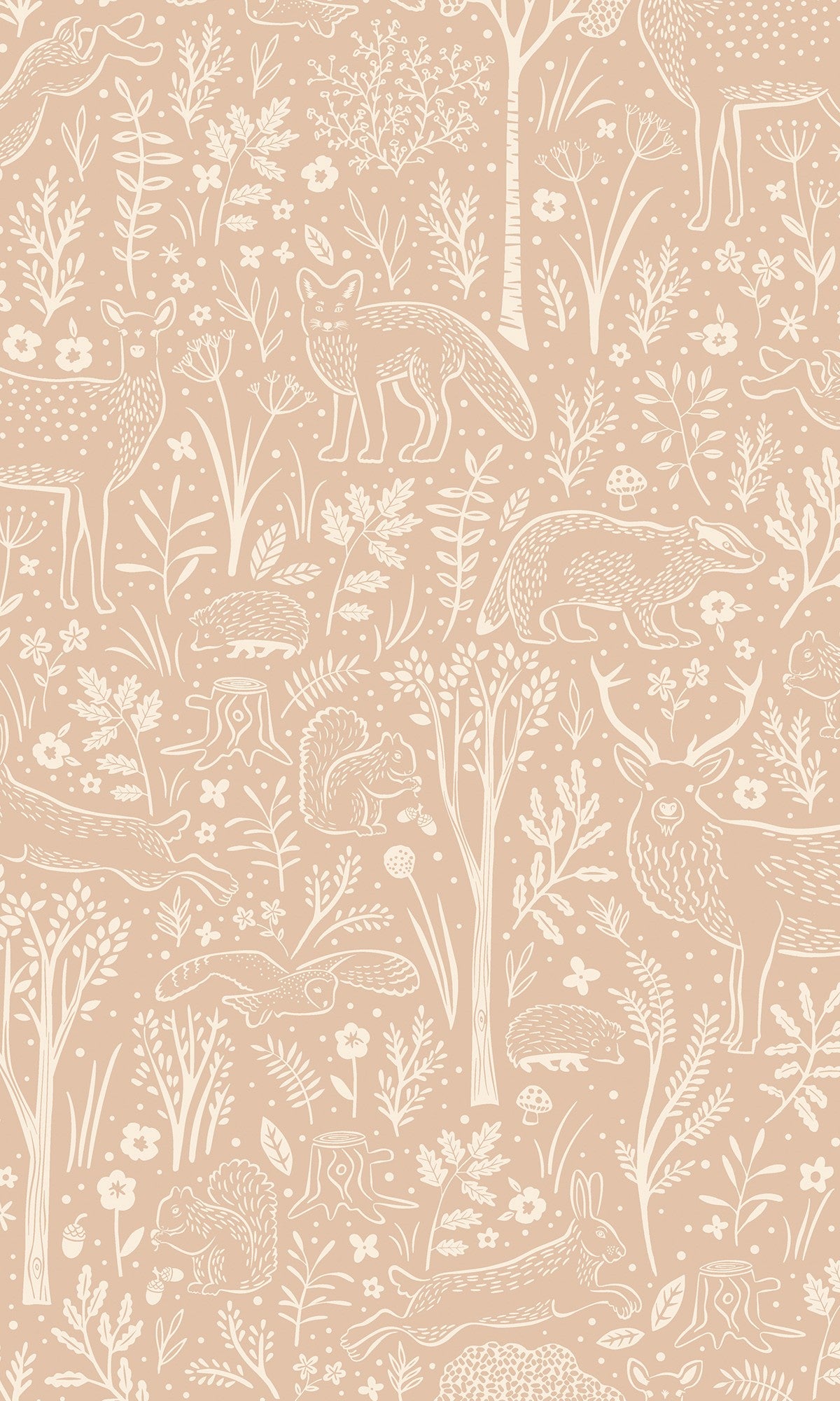 The pattern comes to life with intricate, tone-on-tone illustrations rendered in a gentle off-white shade. The result is a subtle, elegant contrast that feels airy, modern, and visually calming. The design is rich with delightful woodland details, including graceful deer, playful foxes, curious squirrels, nimble rabbits, hedgehogs, and badgers, all nestled among delicate trees, lush foliage, mushrooms, and soft floral accents.
