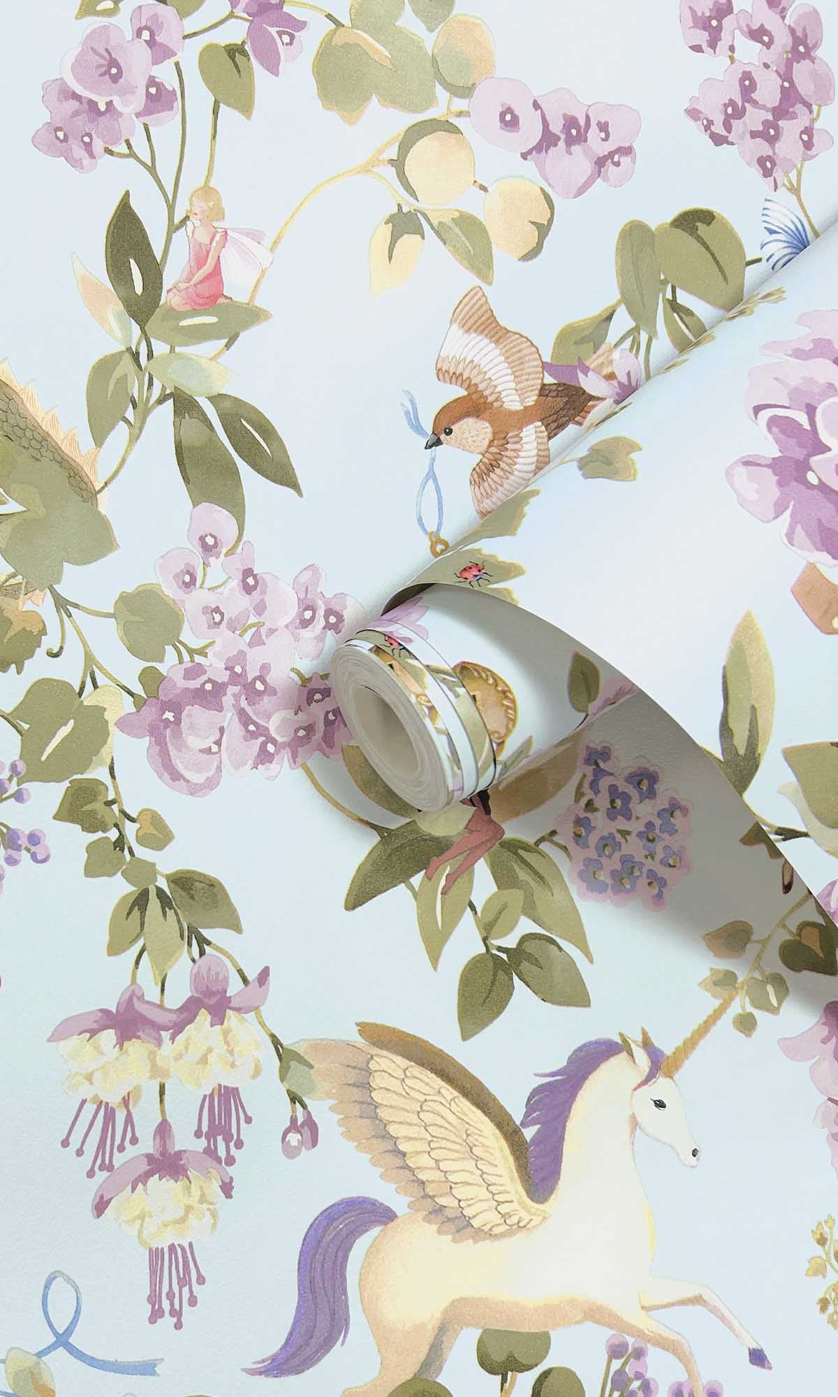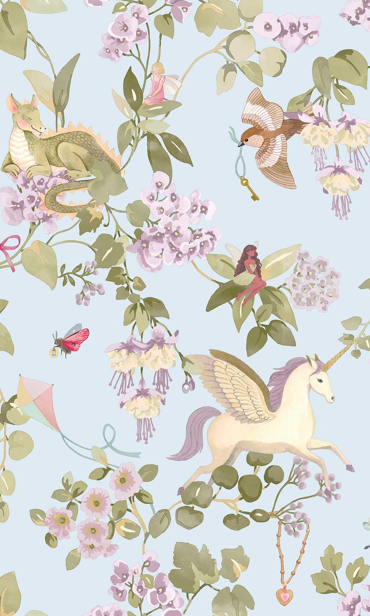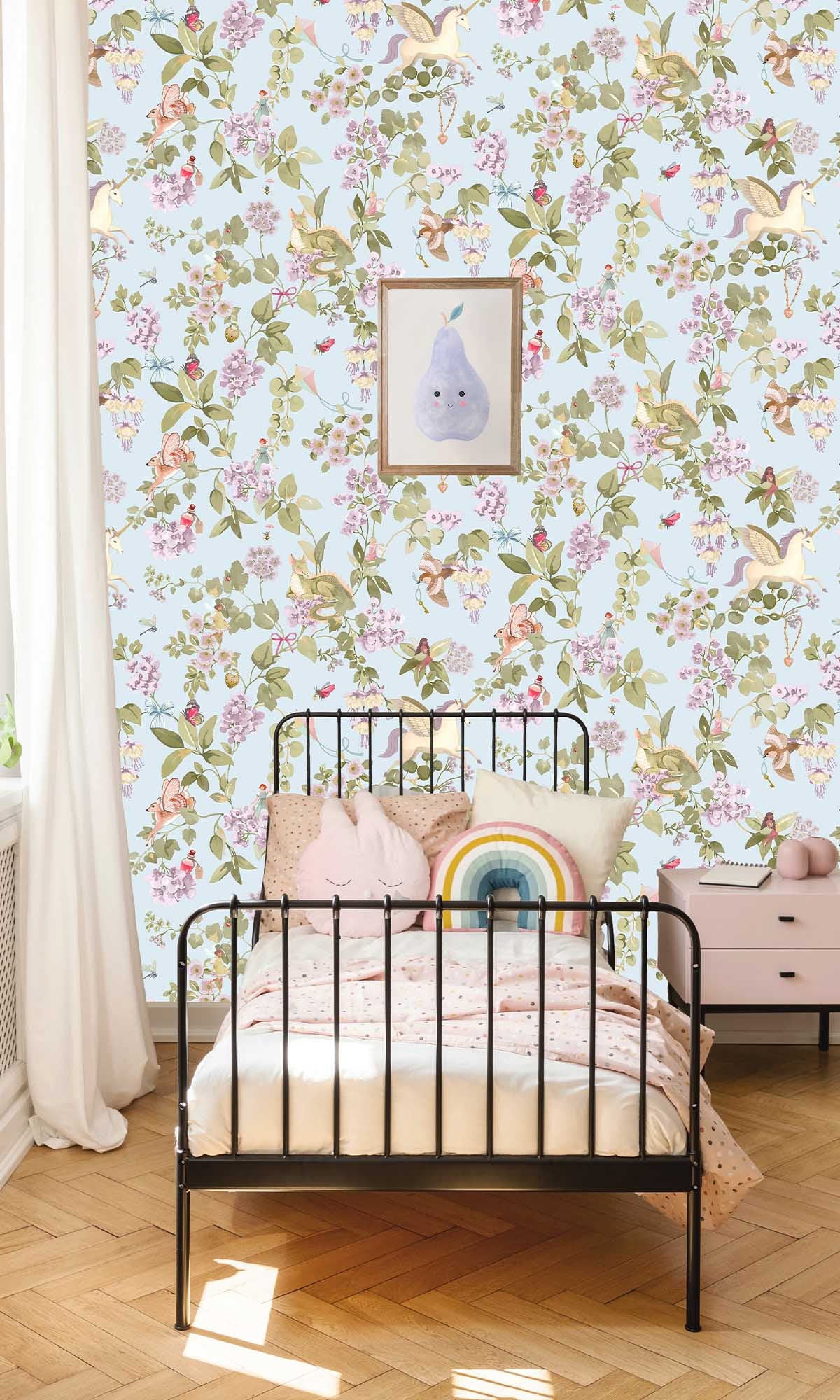 Imagine this: you step into a room and—whoa!—it feels like you’ve just dived straight into a storybook. The walls? A delightful mix of soft flowers, and if you look a bit closer, you might catch some playful fairies peeking out, a unicorn showing off, or even a dragon snoozing away. This wallpaper isn’t just for looks; it’s practically a ticket to a world of daydreams.