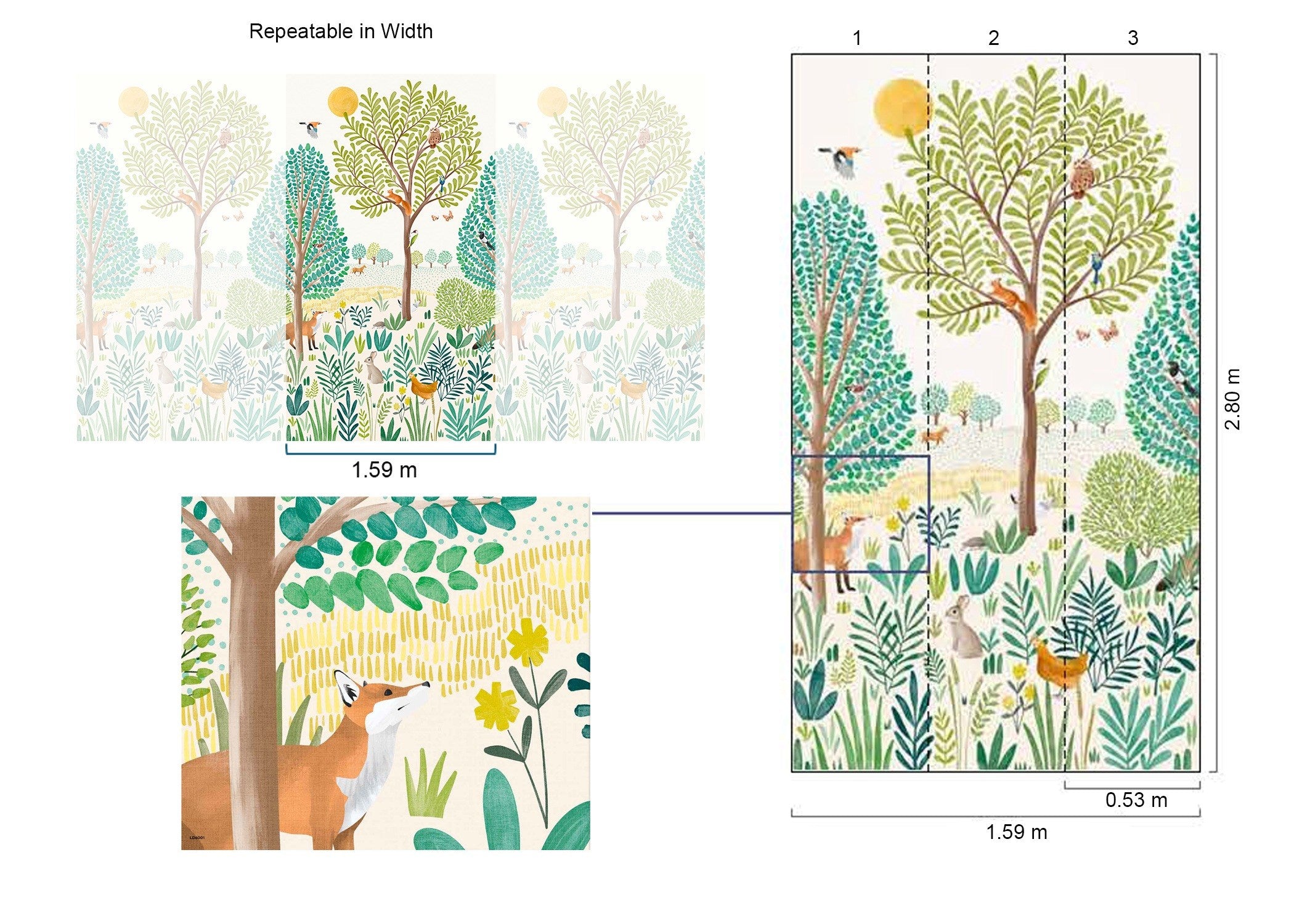 H: 884cm x W: 159cm (3 Panels of 53cm each). Repeatable in width.
