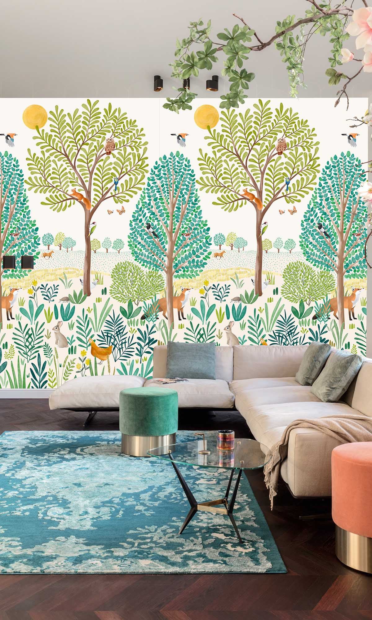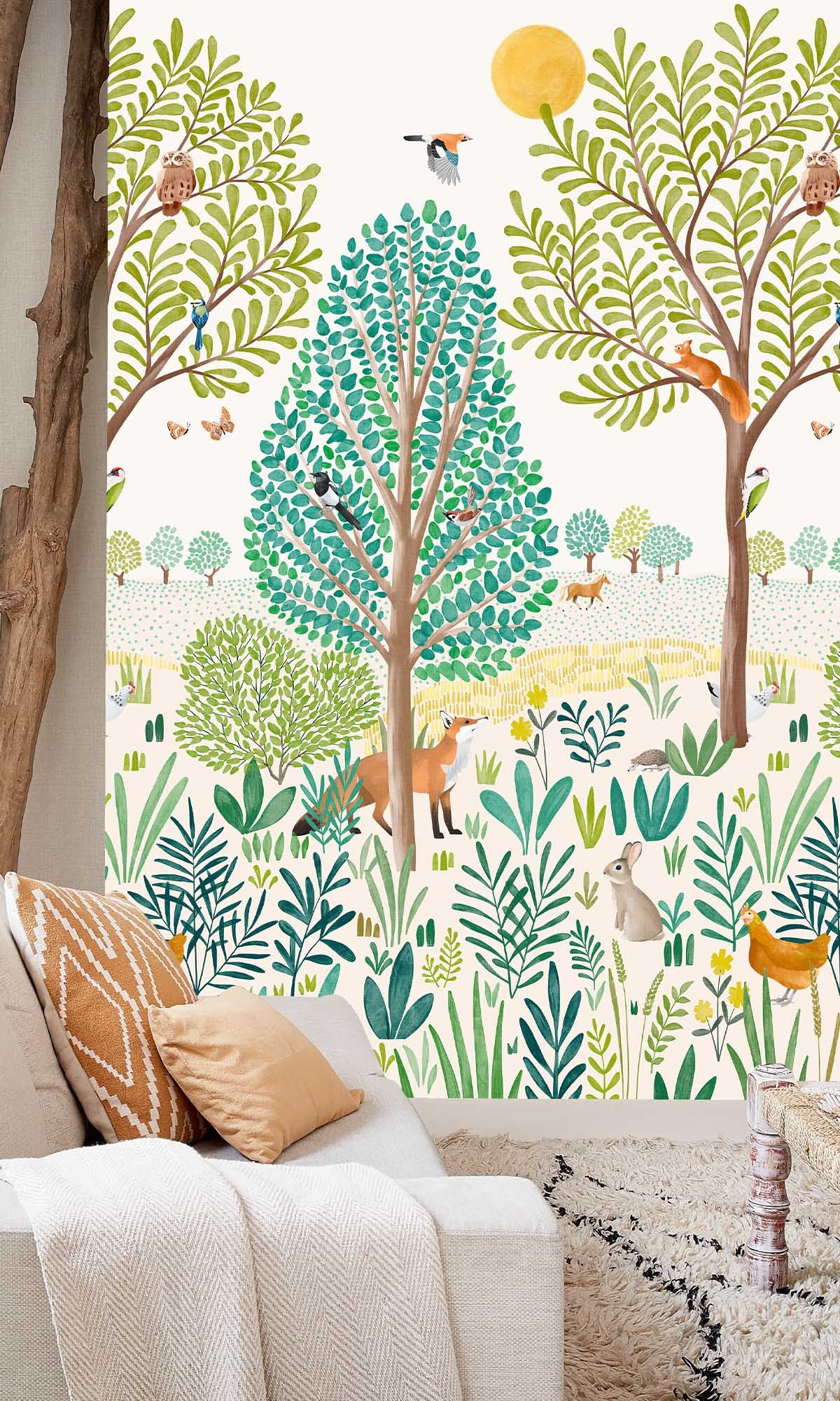 Thanks to its hand-drawn, stylized illustrations, this nature wallpaper exudes a whimsical, fairy-tale charm—perfect for igniting imagination while keeping a peaceful atmosphere. The lightly textured finish adds depth without overwhelming the soft, child-friendly aesthetic.