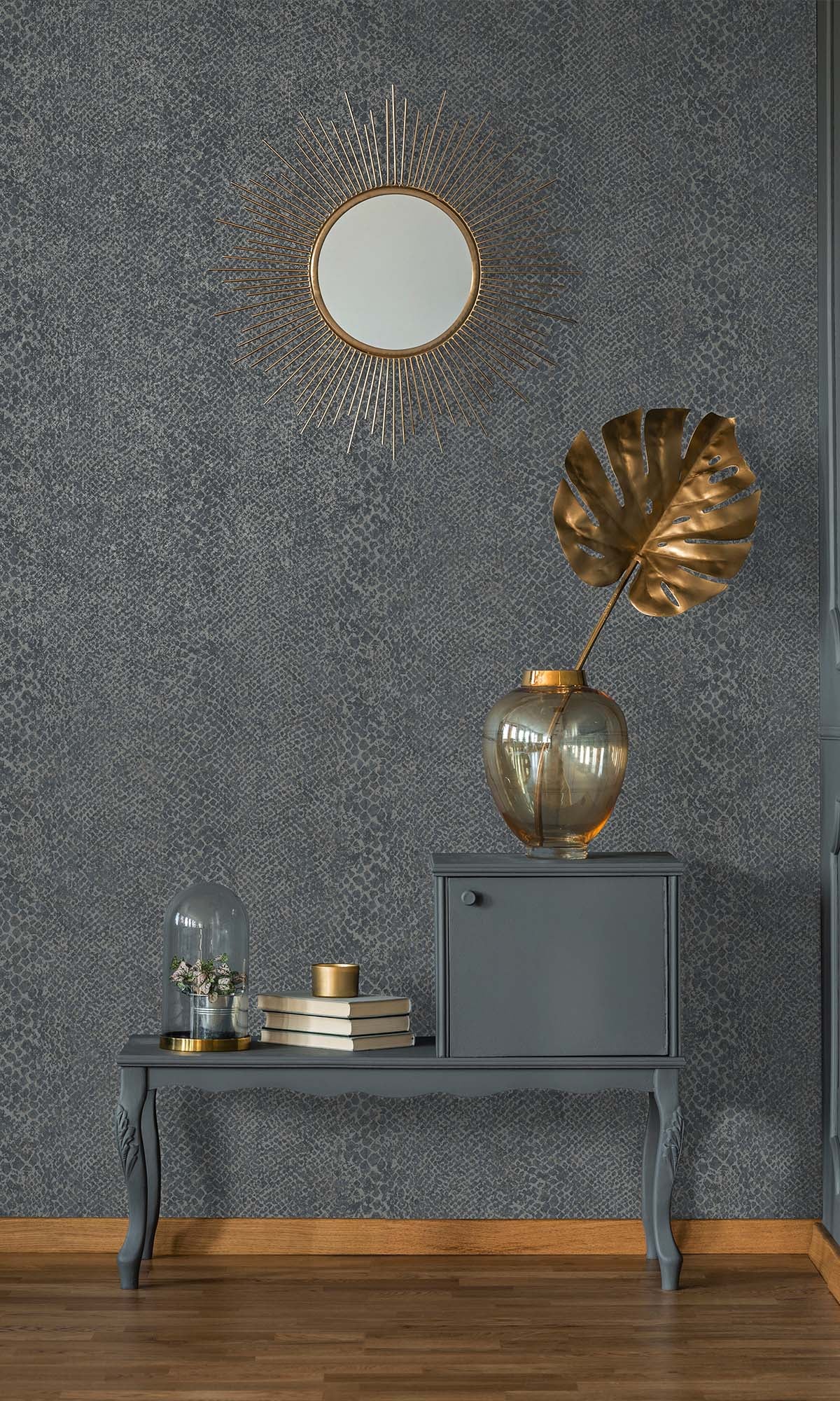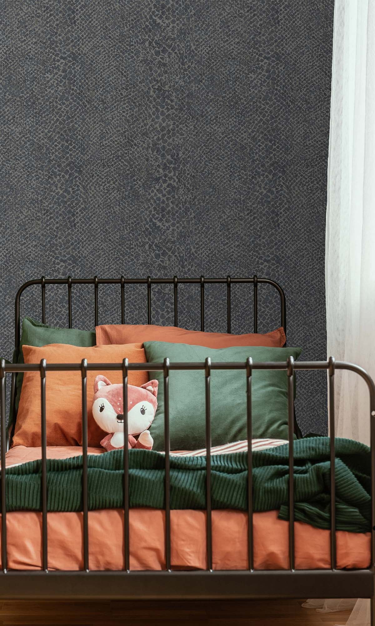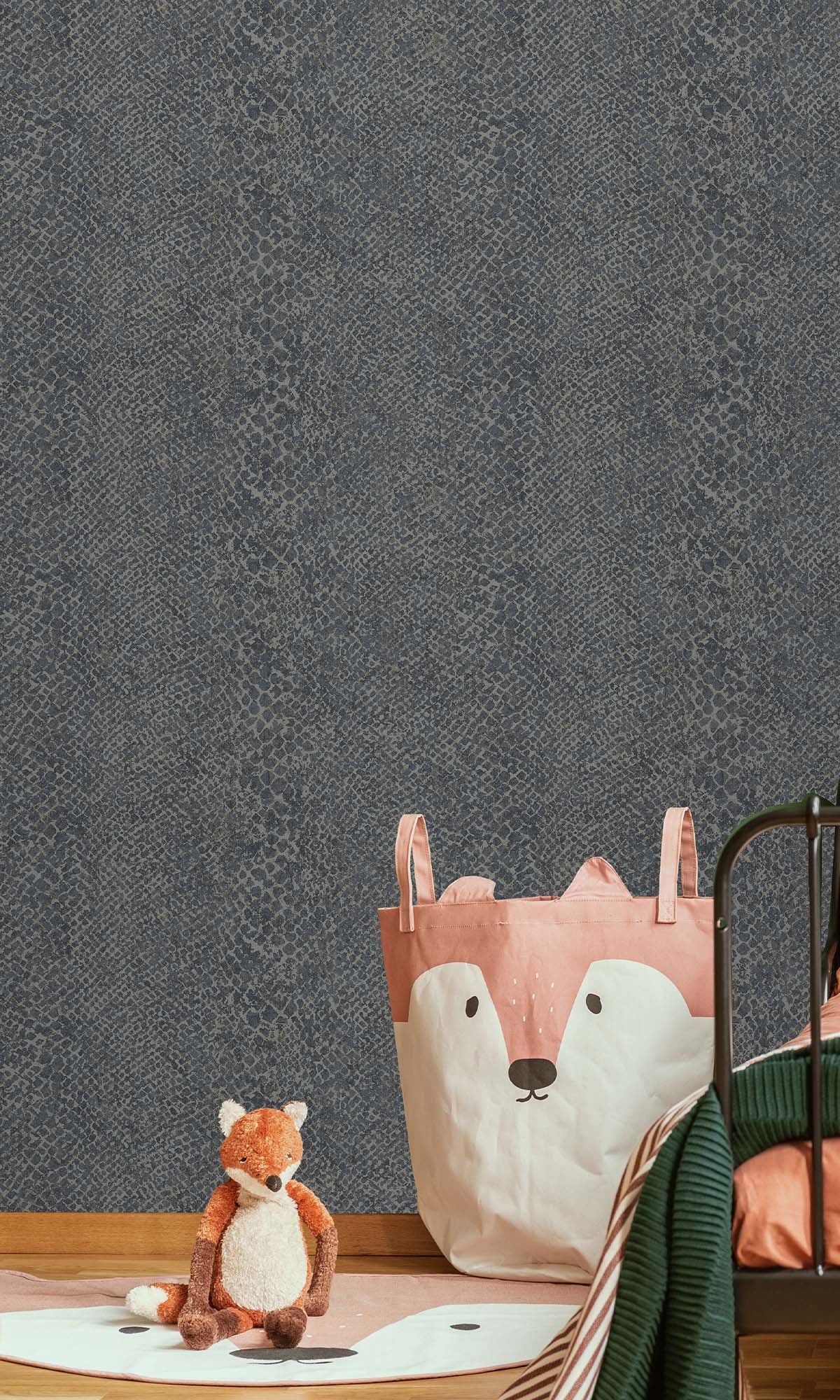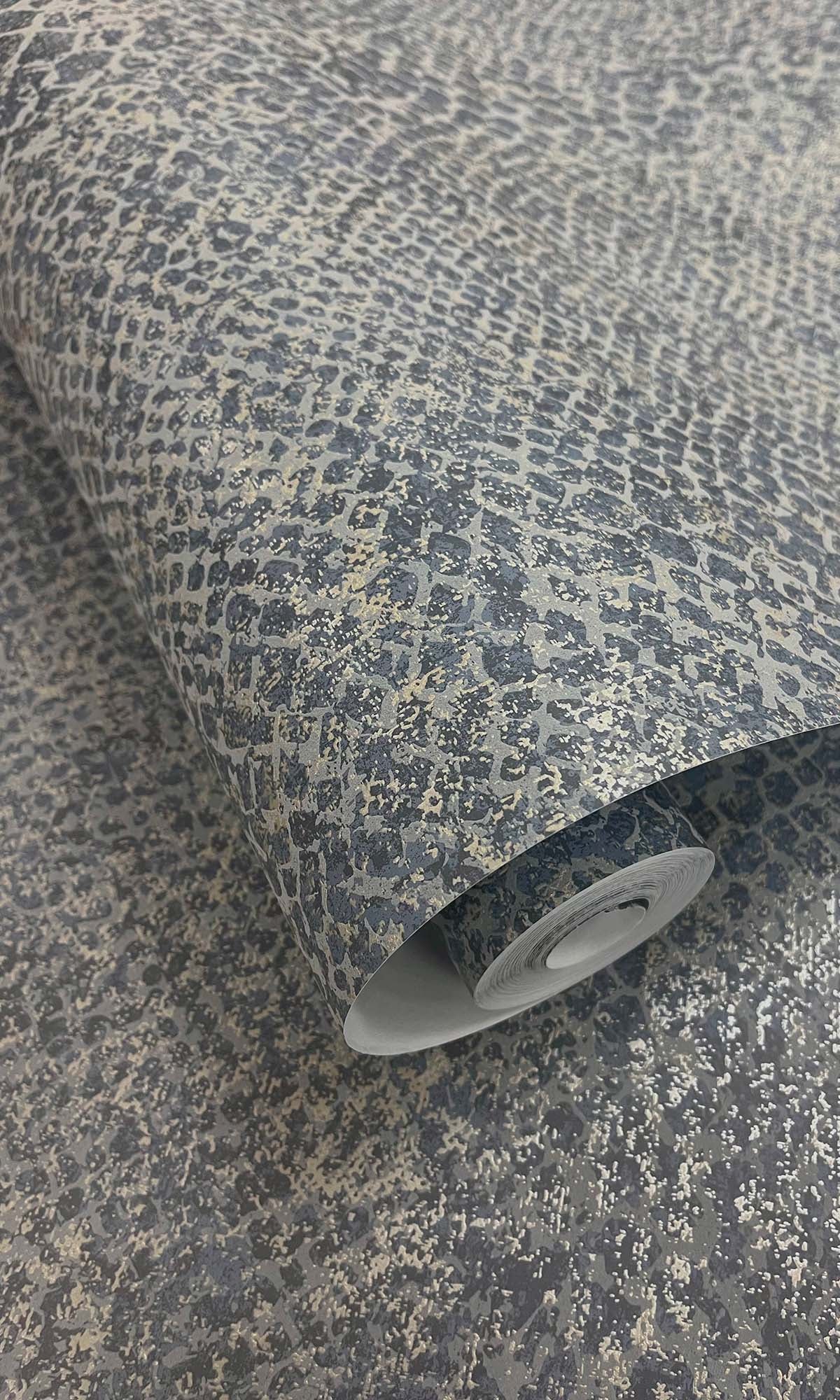 This snake-skin wallpaper? It's got this wild, but classy vibe because of the pattern and those raised scales. And get this – there are tiny metallic bits in there that give it a cool shimmer, not too much, just enough.
