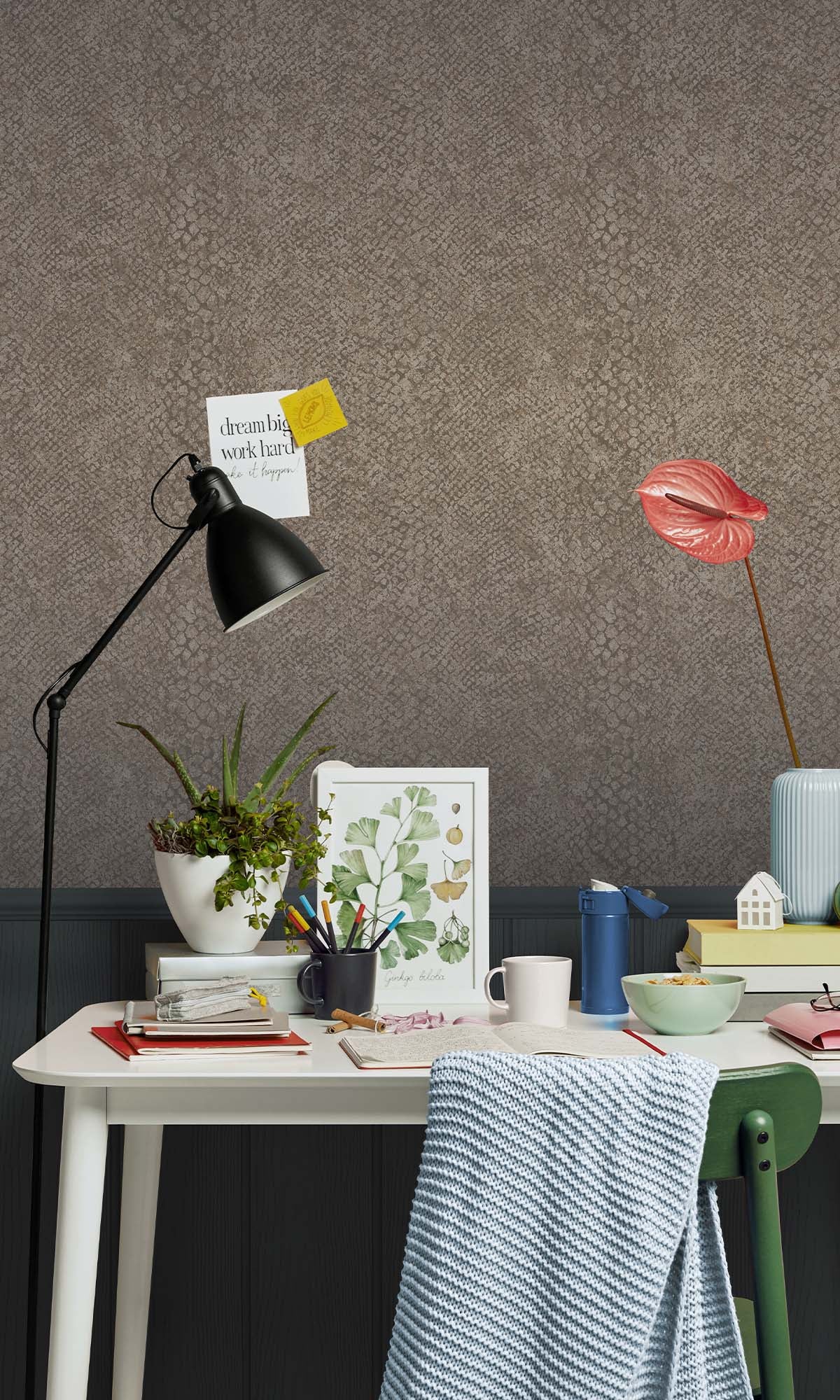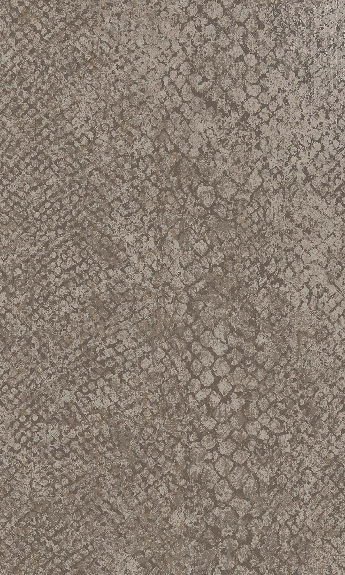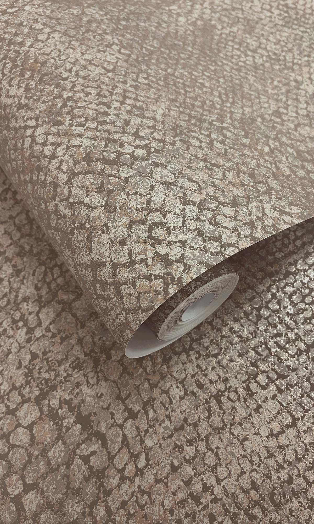 This snake-skin wallpaper? It's got this wild, but classy vibe because of the pattern and those raised scales. And get this – there are tiny metallic bits in there that give it a cool shimmer, not too much, just enough.