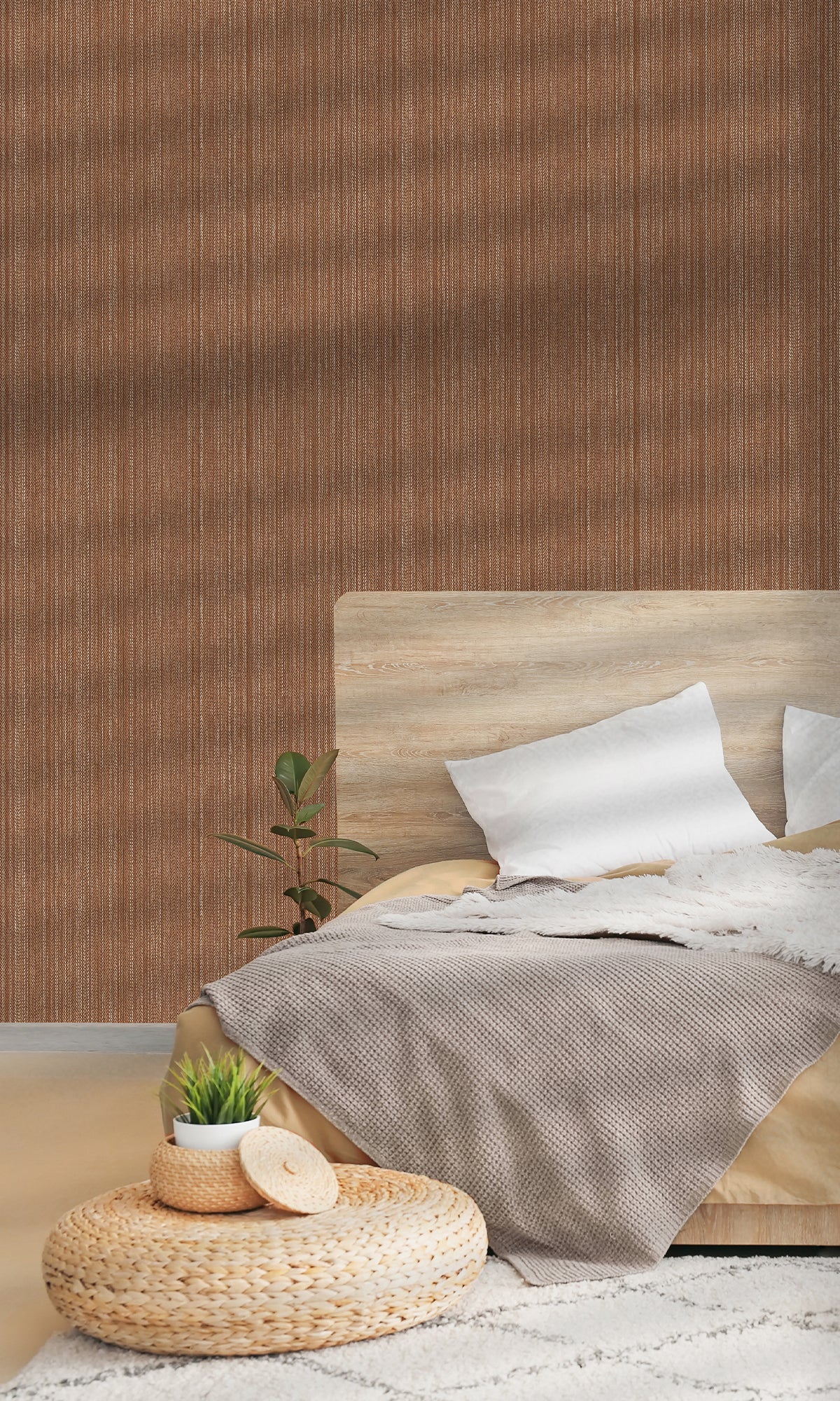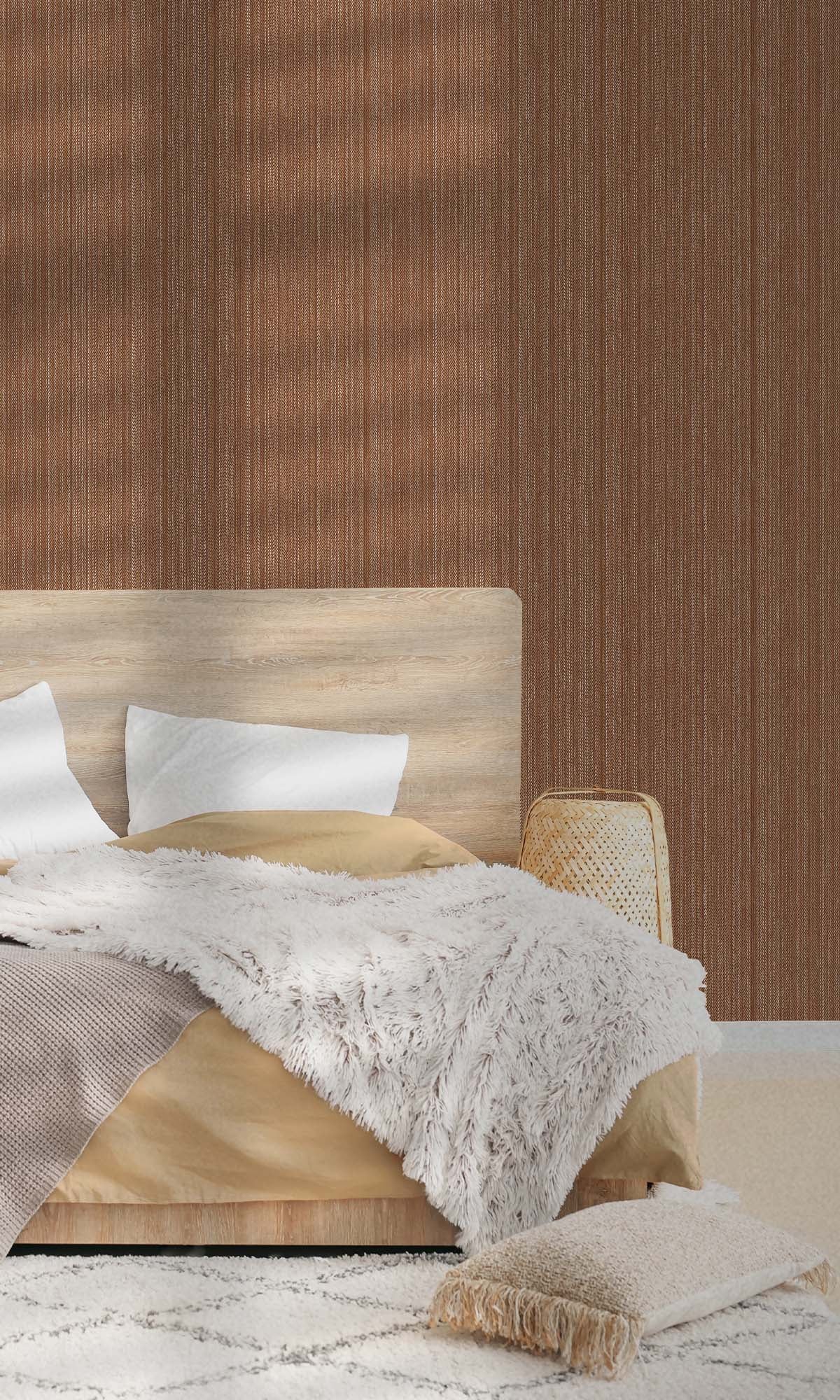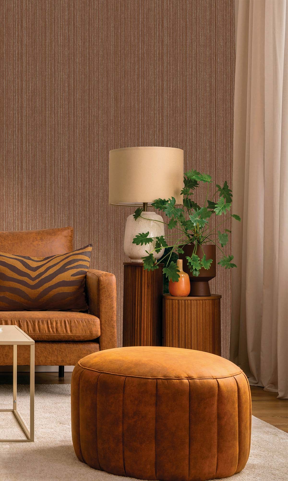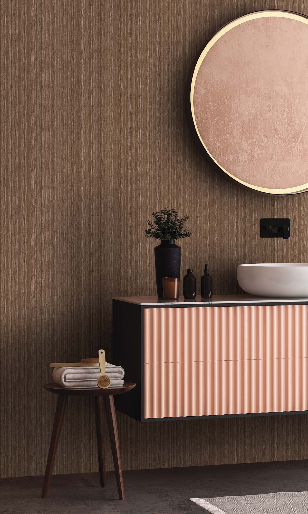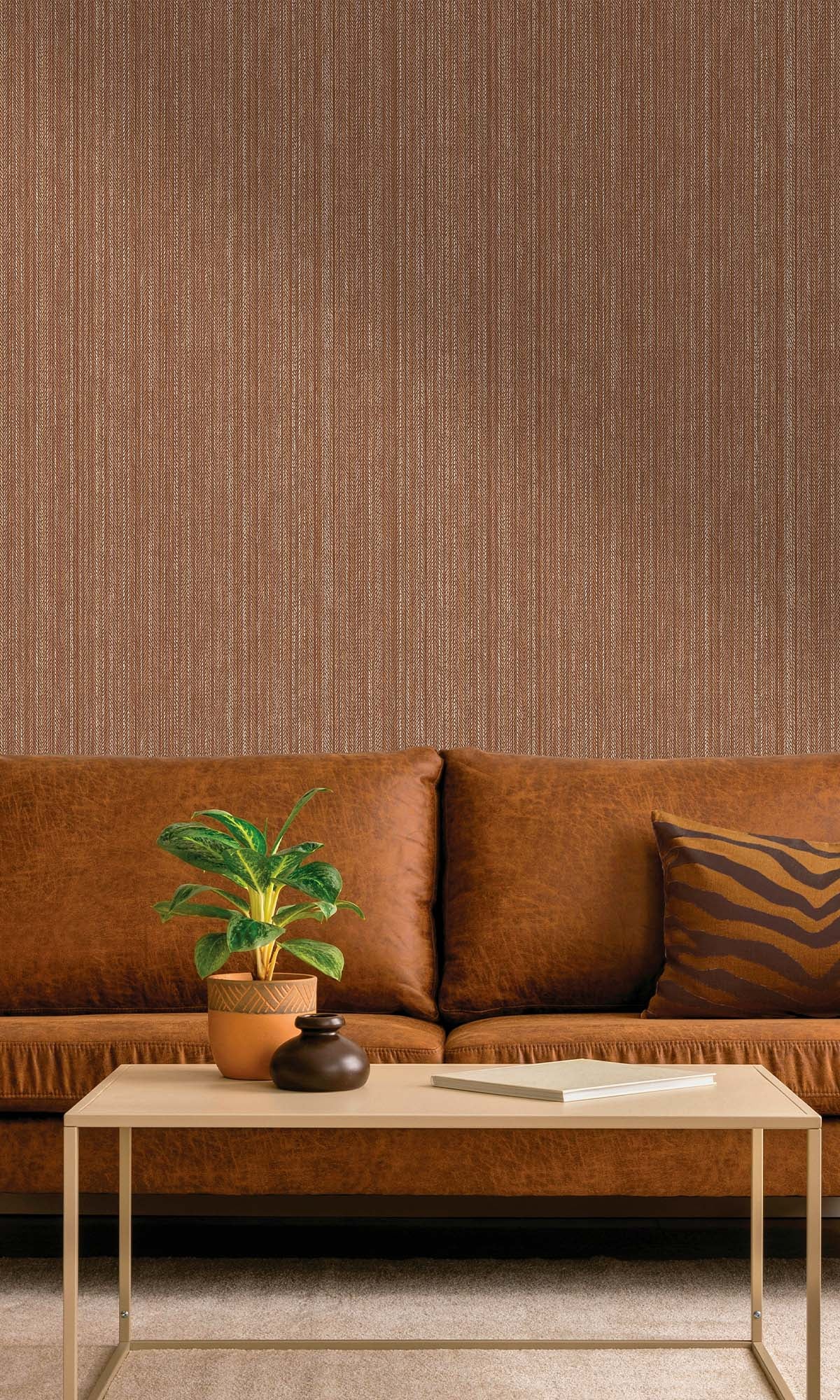 This striped wallpaper is pretty classy. It's got thin, shiny lines mixed with a bumpy, zig-zag texture. The way the pattern and depth play together is kinda cool. It looks like it moves a little, and the shiny bits catch the light just enough to make it pop. It's not too loud, so it makes rooms look better without being too much. It's great if you want to do something cool with a wall, adding some texture. It's chill enough to go with simple or fancy decor.