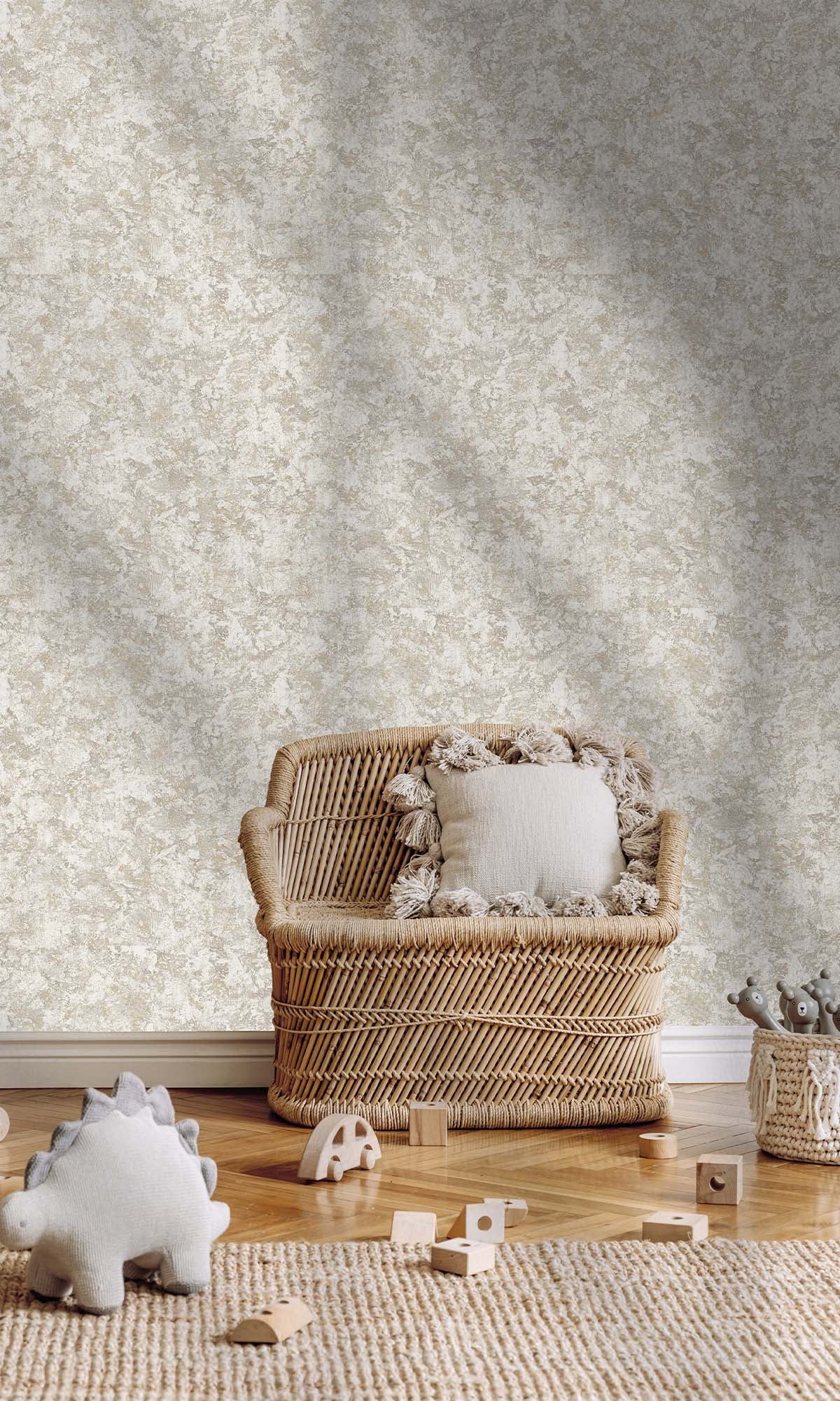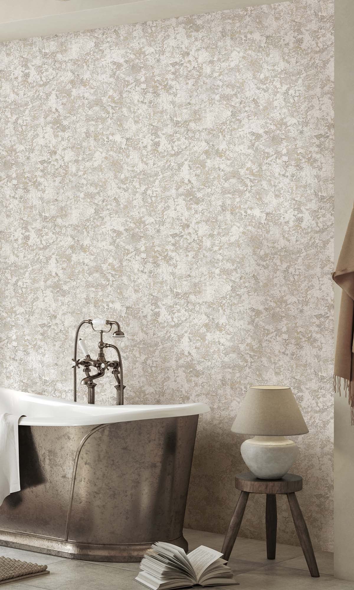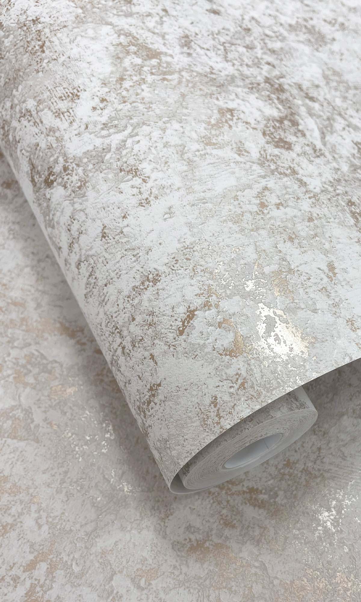This wall covering looks really nice with a plaster style. It has raised bumps and tiny bits of metal that catch the light. The wall covering has a lot of depth to it. It feels nice to touch. When the light hits it it shines in a way. The colors are layered in a way that makes it look like it was made by hand. It reminds me of the wall covering you see in expensive homes. The wall covering has a quality to it because of the different textures and colors. This wall covering is, like a custom made finish that you would find in a house.