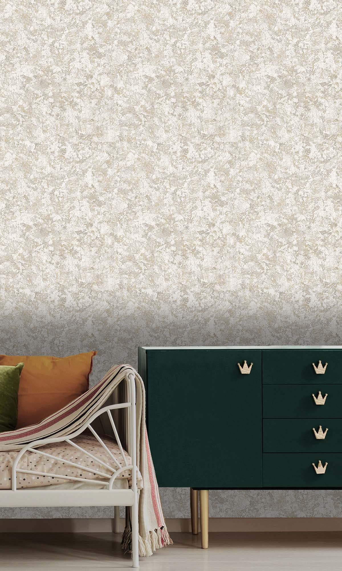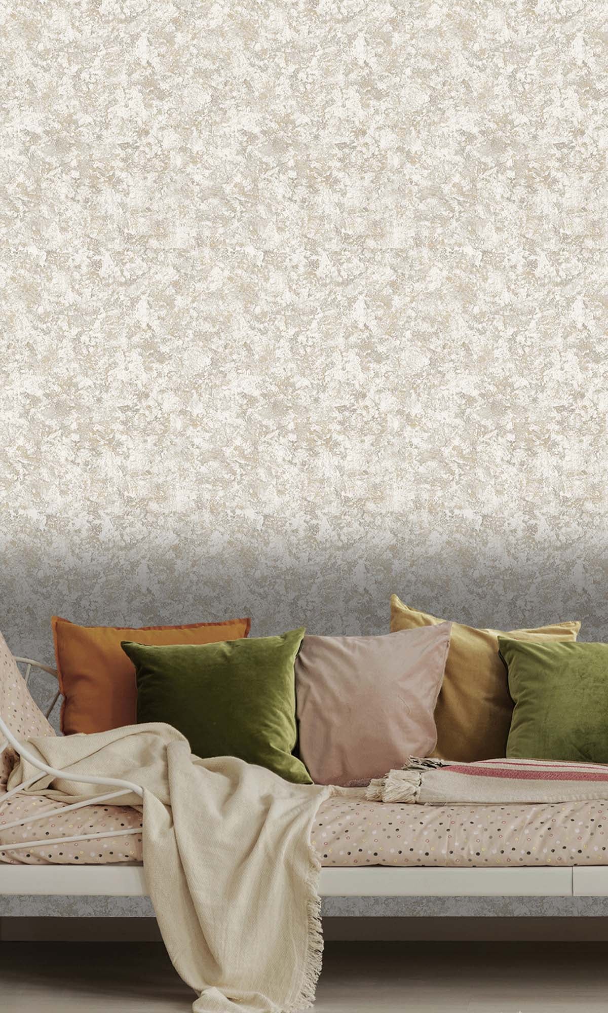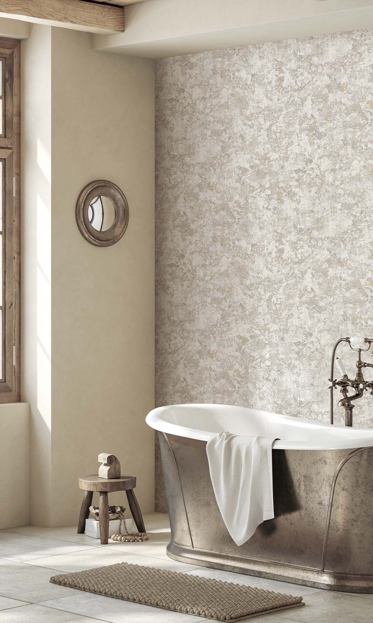 This wall covering looks really nice with a plaster style. It has raised bumps and tiny bits of metal that catch the light. The wall covering has a lot of depth to it. It feels nice to touch. When the light hits it it shines in a way. The colors are layered in a way that makes it look like it was made by hand. It reminds me of the wall covering you see in expensive homes. The wall covering has a quality to it because of the different textures and colors. This wall covering is, like a custom made finish that you would find in a house.