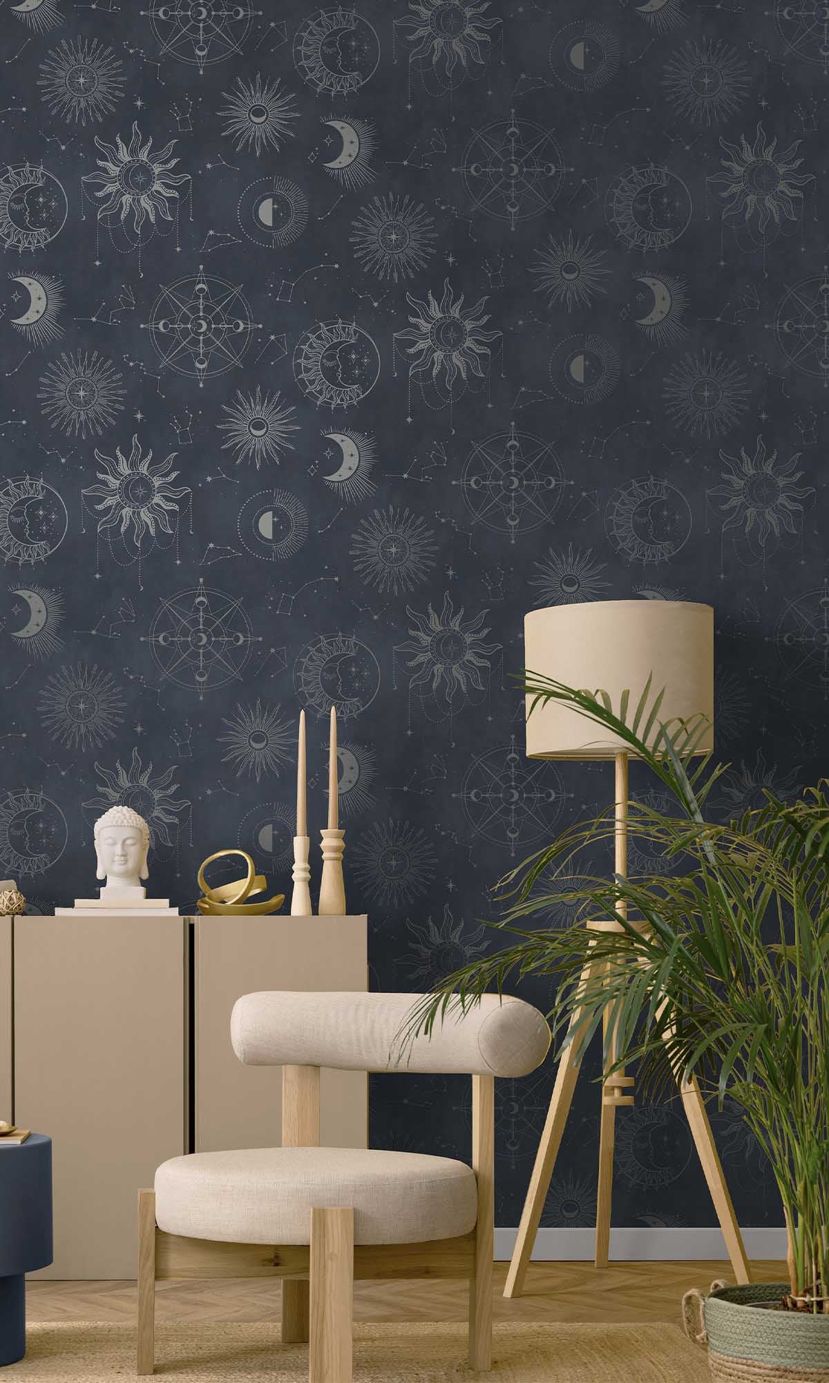 Perfect for a feature wall or covering an entire room, this wallpaper complements modern minimalist interiors as well as classic, traditional spaces. Ideal for bedrooms, living rooms, reading nooks, or creative studios, it instantly adds depth, intrigue, and a touch of cosmic elegance.