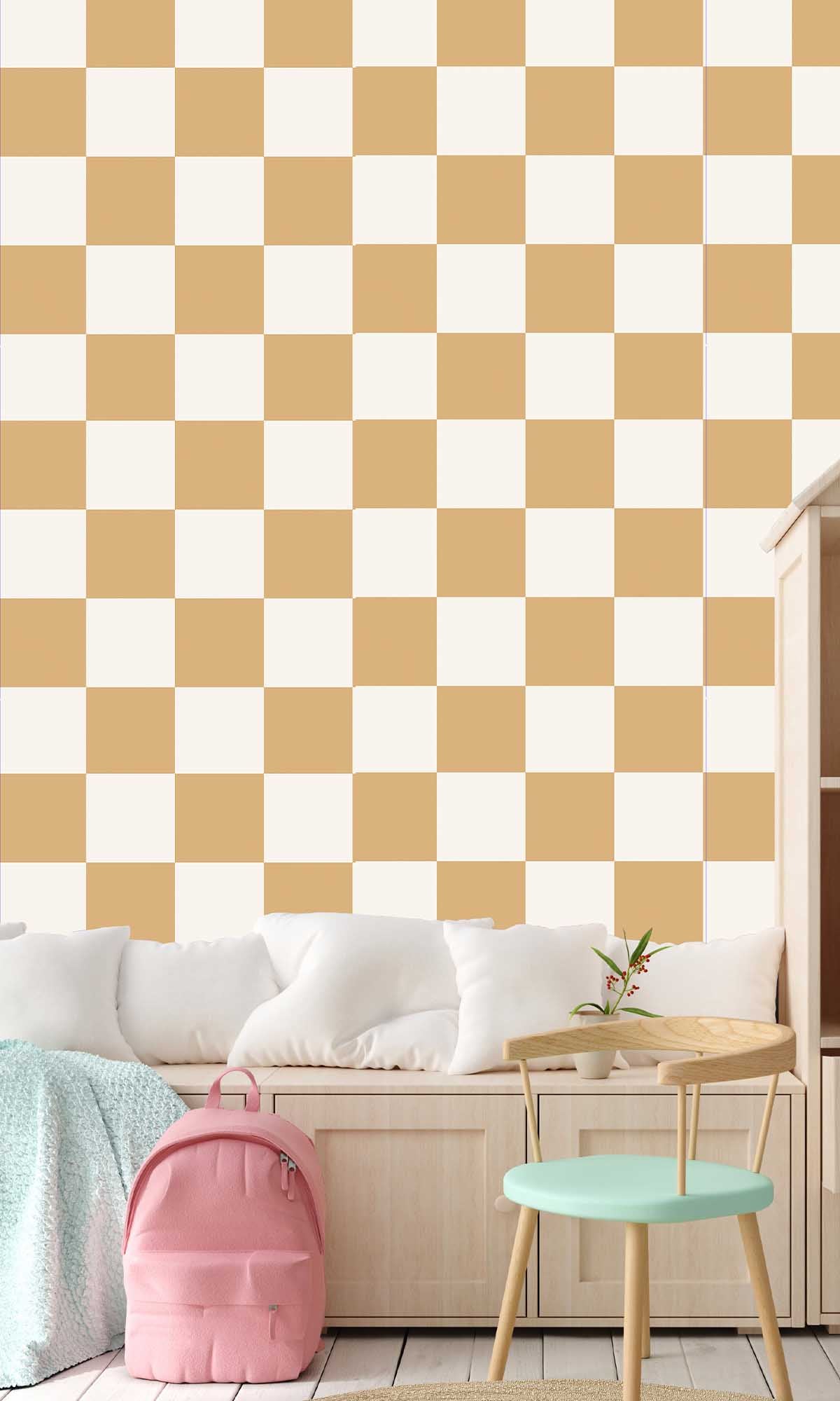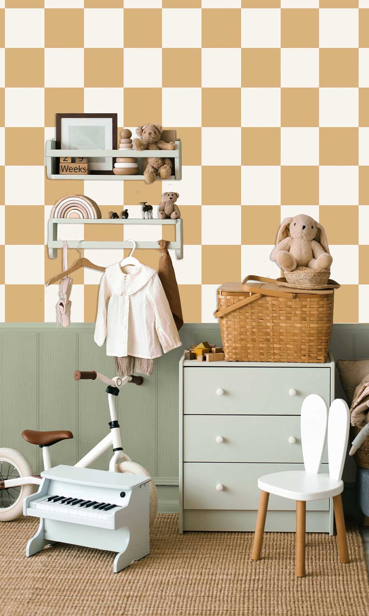 Makeover your room with our Adventure Awaits Check This Out! wallpaper to add a touch of personality and originality. This charming design, which has a striking checkerboard pattern that instantly brightens any space while maintaining a calm atmosphere, finds the ideal mix between being lively and being calming. It adds a playful touch without overpowering the mood, making it the perfect choice for a child's room, nursery, or play area.