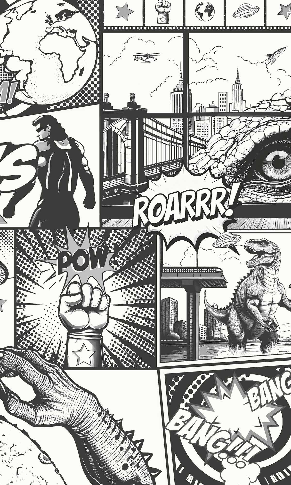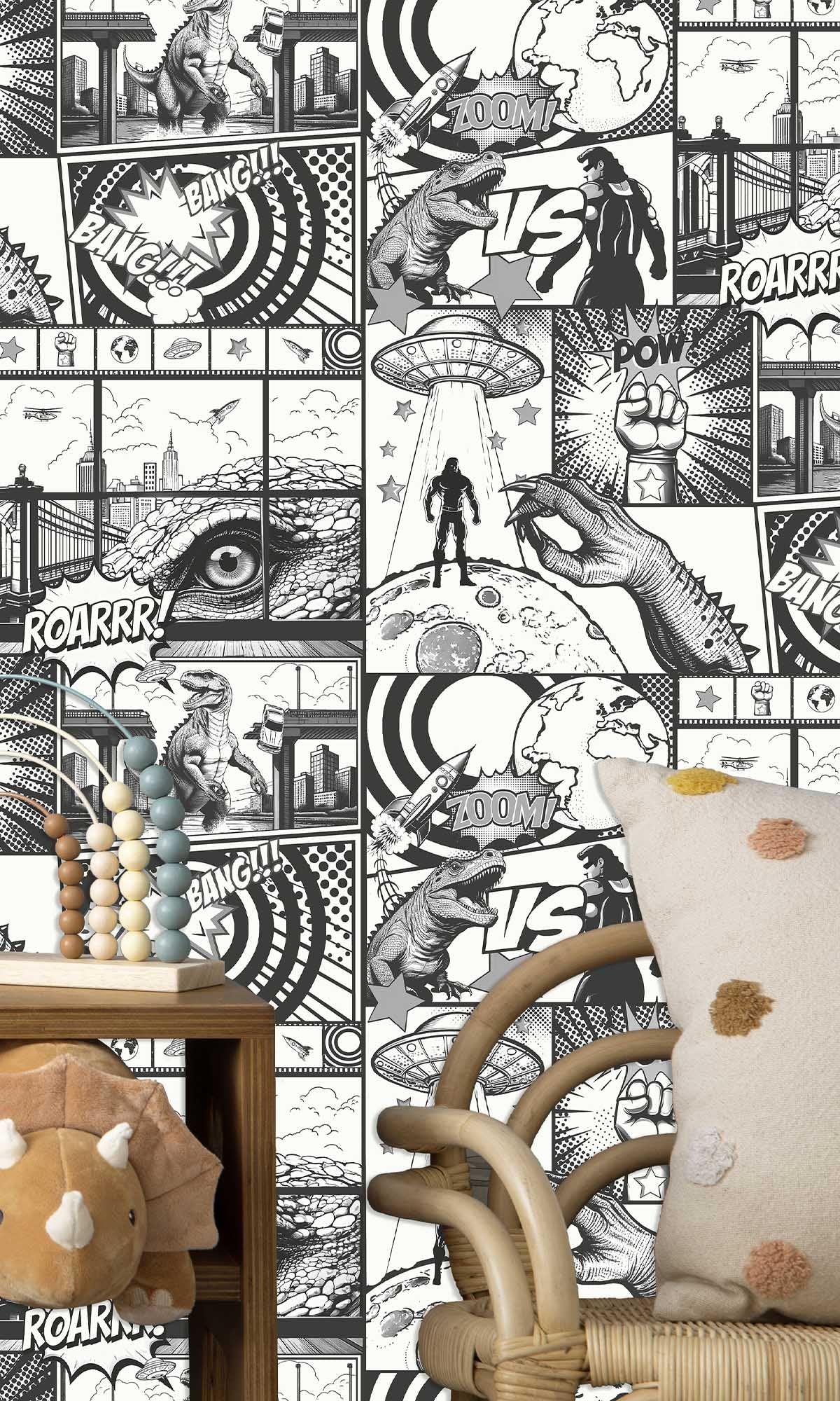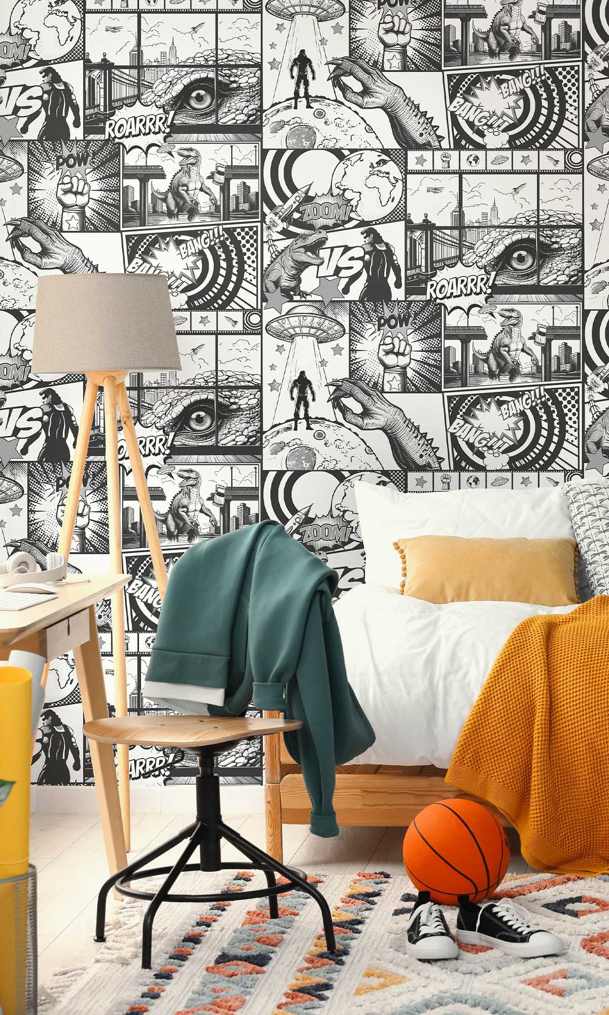 Unless you include your inner superhero, who is undoubtedly smiling right now, it's not just for kids. Regardless of whether it's a bedroom, a playroom, or your personal retreat, this wallpaper turns any area into an enormous comic strip.