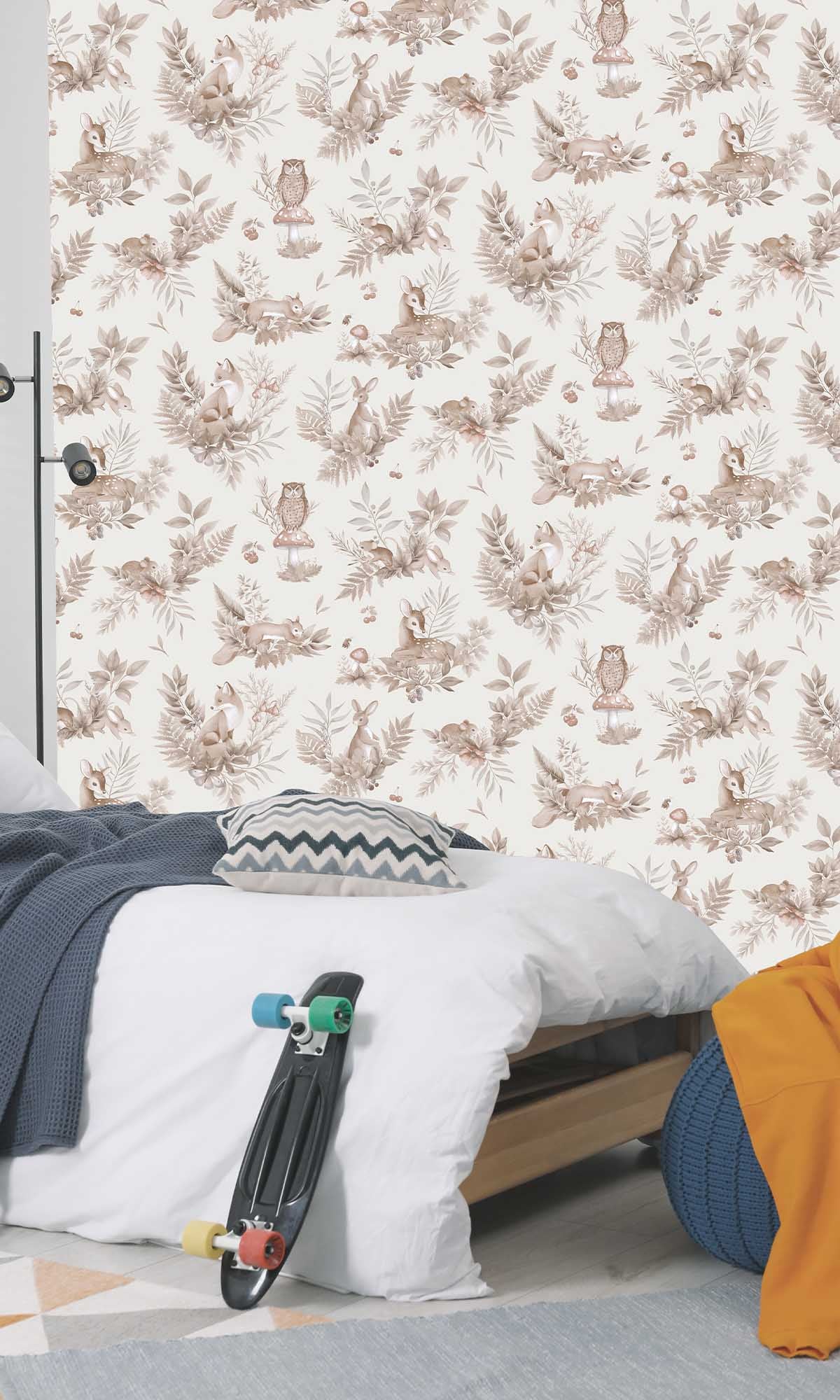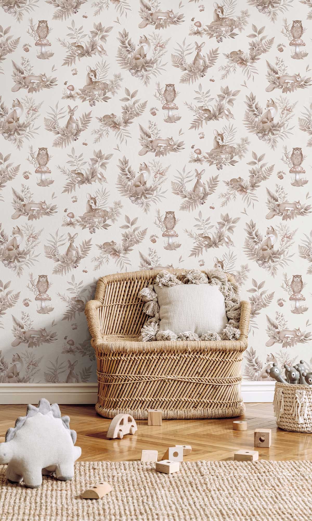 Imagine entering a room and, all of a sudden, feeling as though you have entered a fairy tale. This Adventure Awaits Forest Friends Wallpaper's magic lies in that. With adorable small animals, verdant surroundings, and those adorable mushrooms that shout, ""Tiny gnomes are hiding here!"" it's brimming with woodland charm.