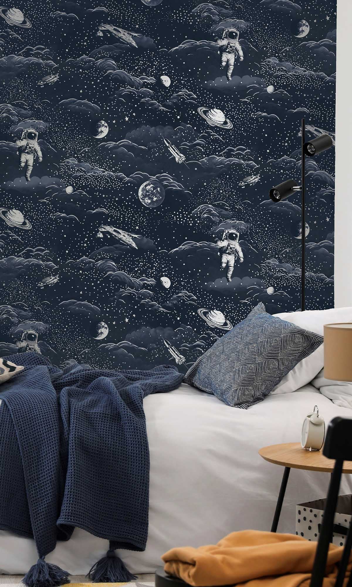 The delicate metallic details add a touch of shimmer, making the stars sparkle and the rockets shine, bringing the magic of outer space right to your walls. It's perfect for children's bedrooms, nurseries, and playrooms, inspiring curiosity and creativity while keeping a calm, dreamy vibe.