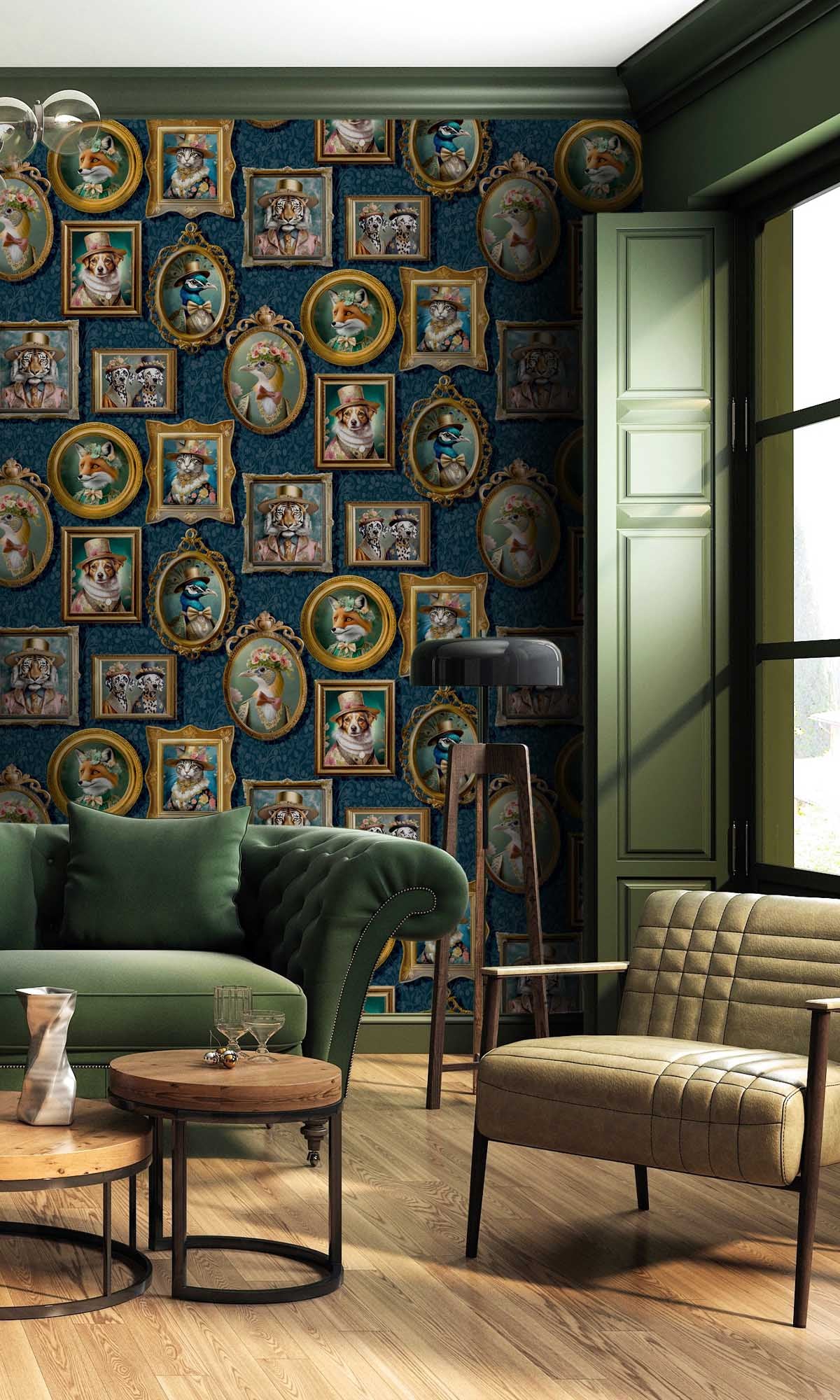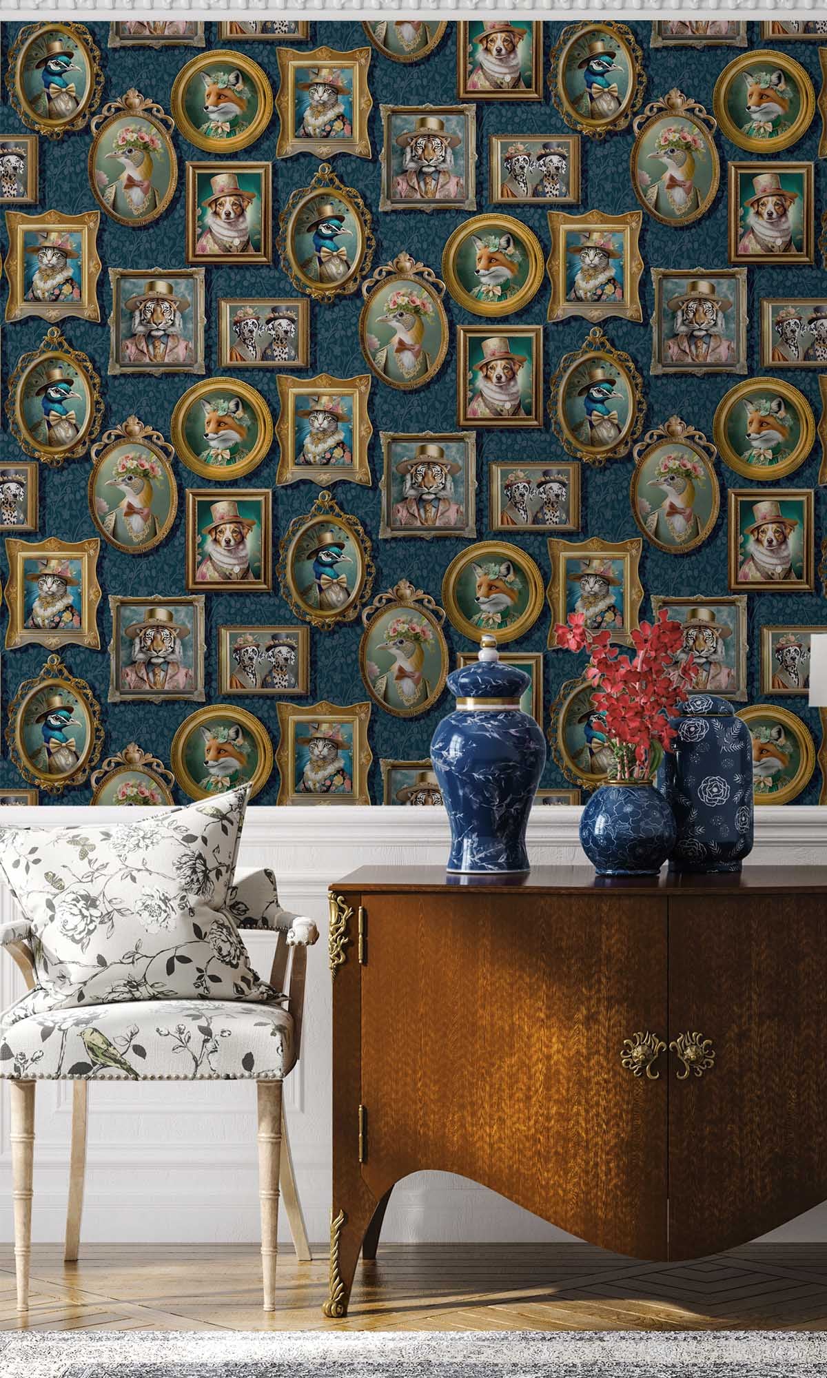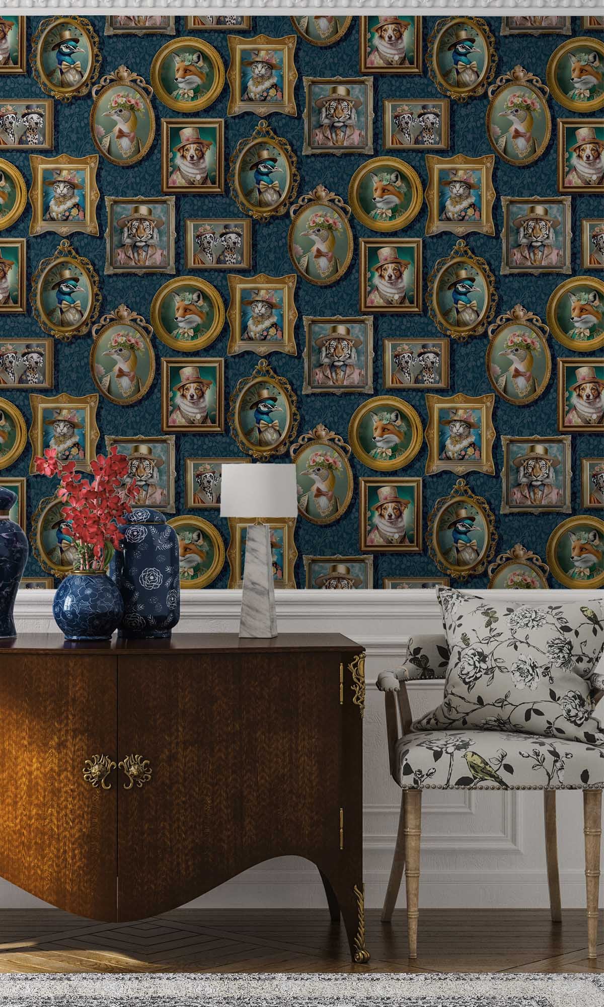 The Framed Regal Beasts Wallpaper is a work of art that transforms your room into a realm of regal wonder. Use it to create a statement wall that honors creativity, style, and narrative. This unique design, which features picture frames full of adorable animals wearing exquisite Victorian-era clothing, turns any space into a sophisticated gallery of imagination. From elegant foxes in evening gowns to dapper dogs in top hats, every portrait perfectly combines humor, fantasy, and sophistication.