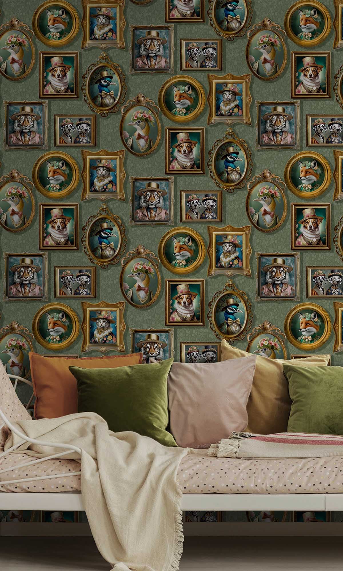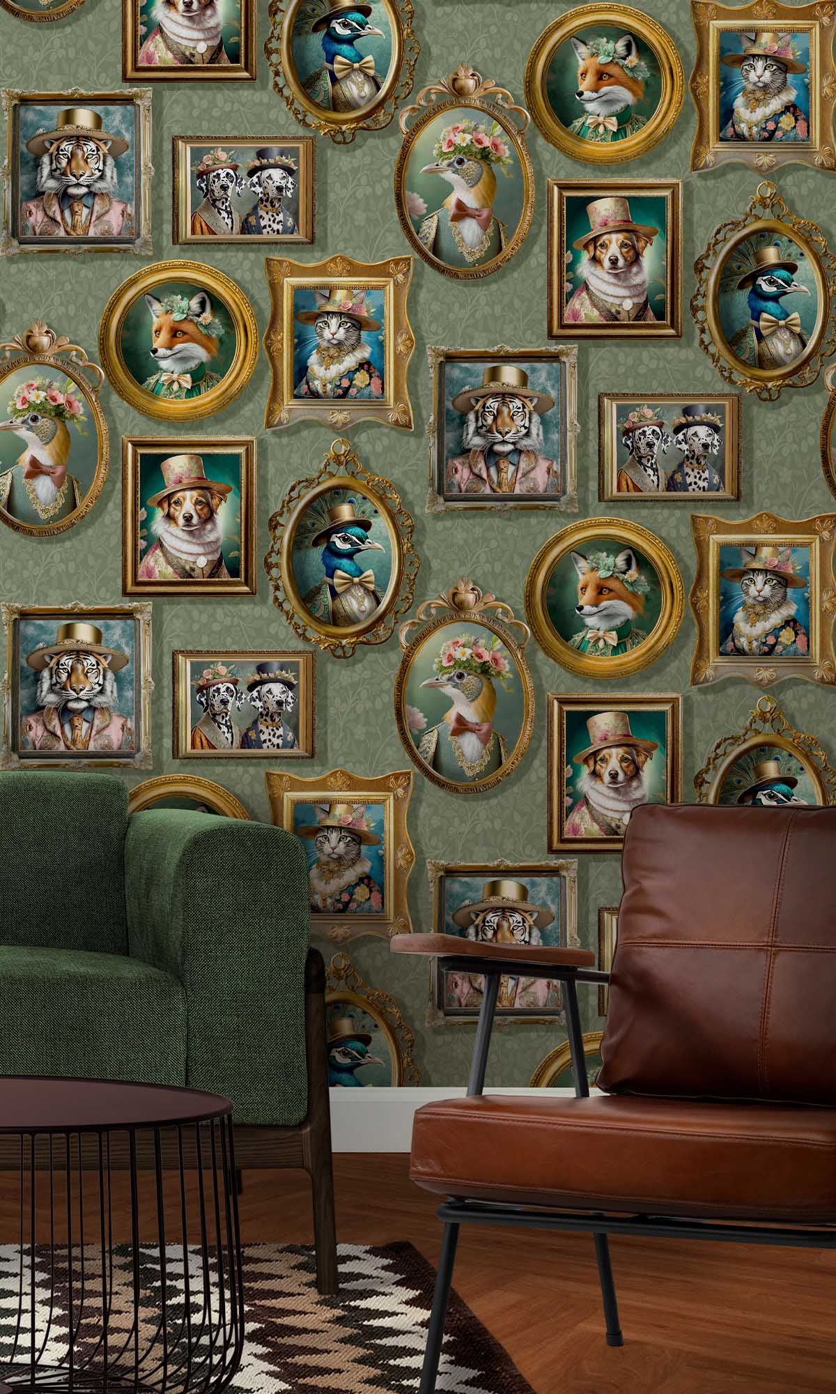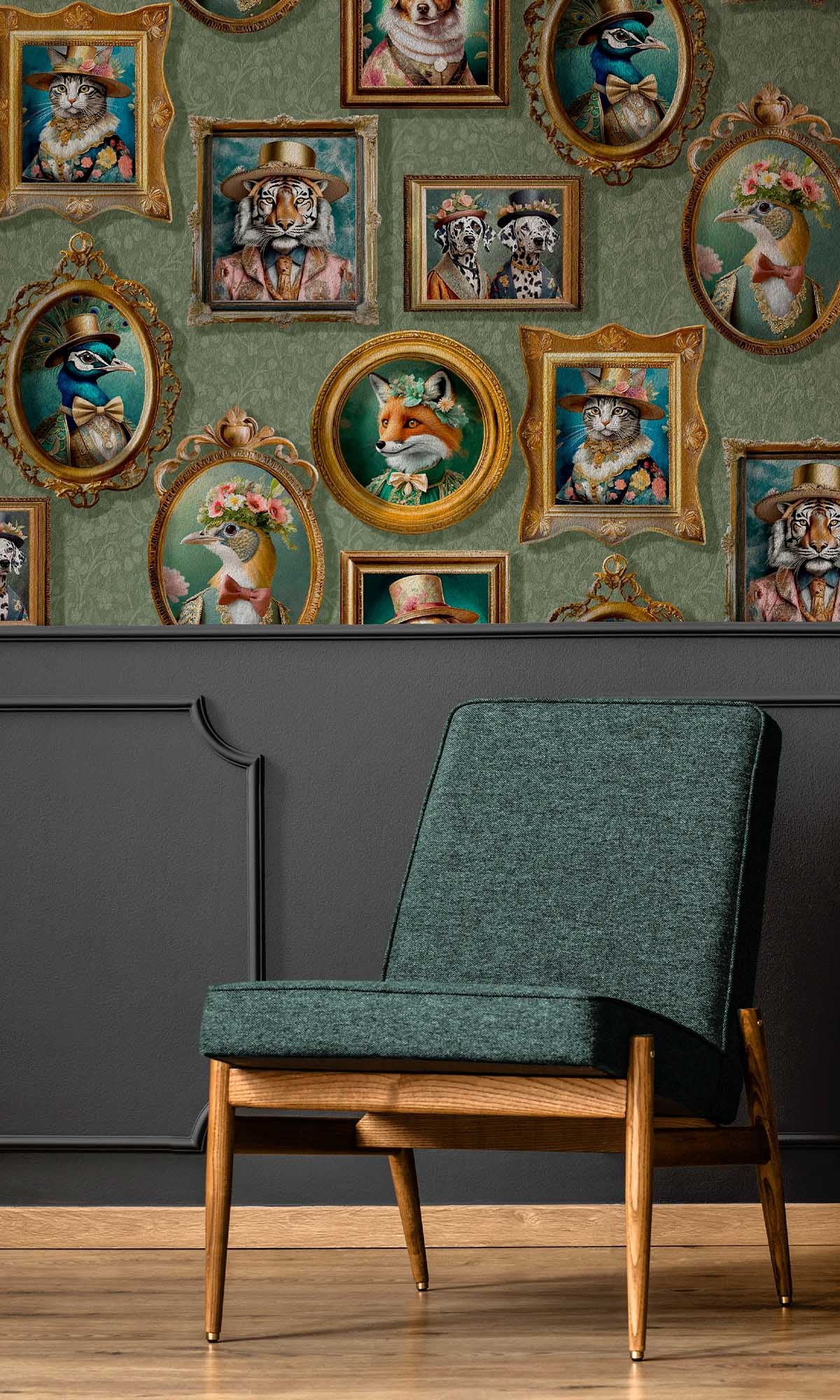 The Framed Regal Beasts Wallpaper is a work of art that transforms your room into a realm of regal wonder. Use it to create a statement wall that honors creativity, style, and narrative. This unique design, which features picture frames full of adorable animals wearing exquisite Victorian-era clothing, turns any space into a sophisticated gallery of imagination. From elegant foxes in evening gowns to dapper dogs in top hats, every portrait perfectly combines humor, fantasy, and sophistication.