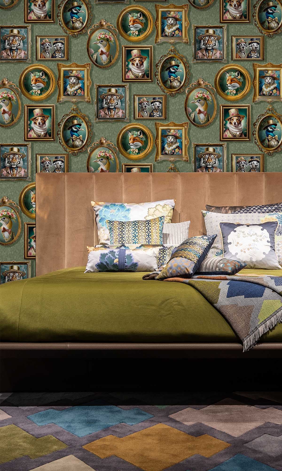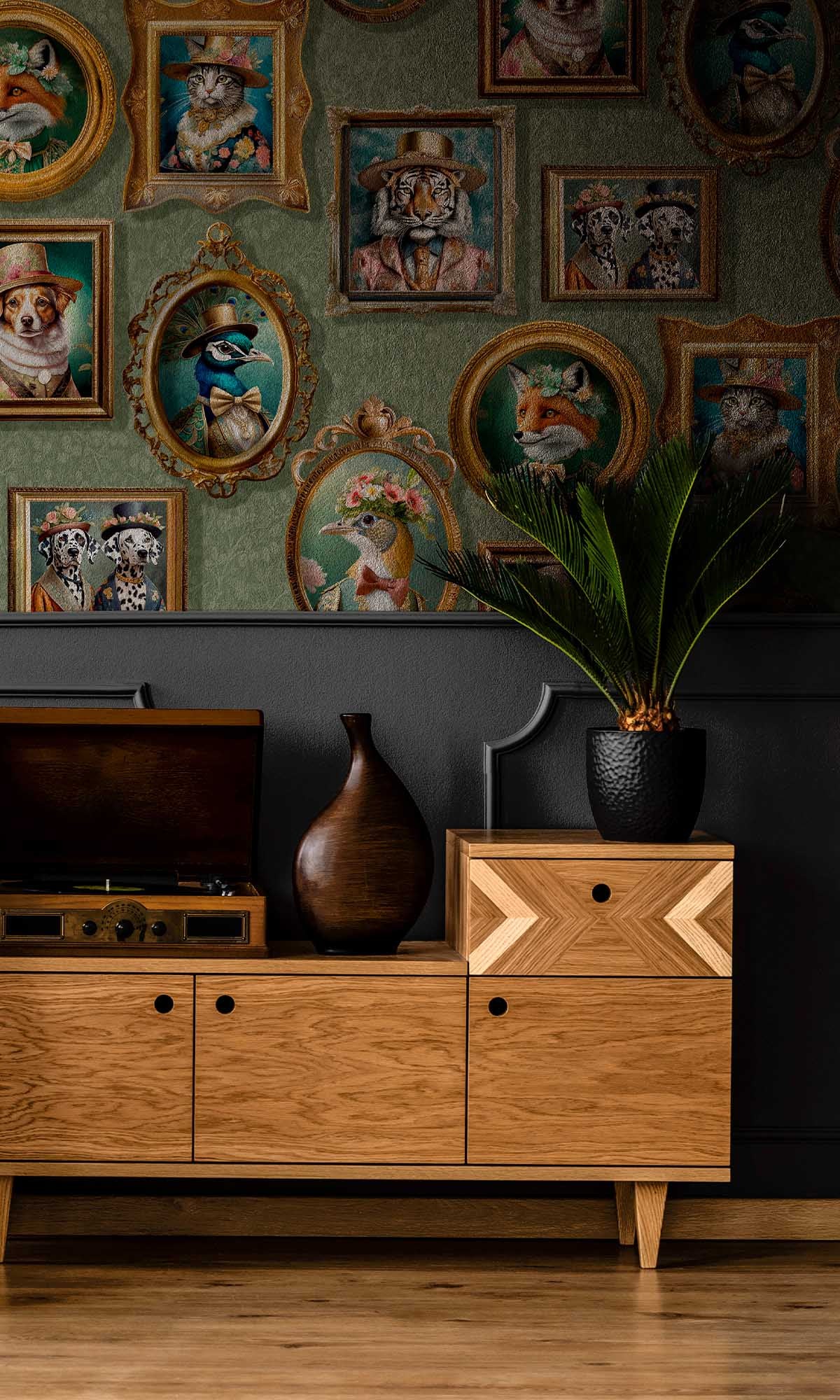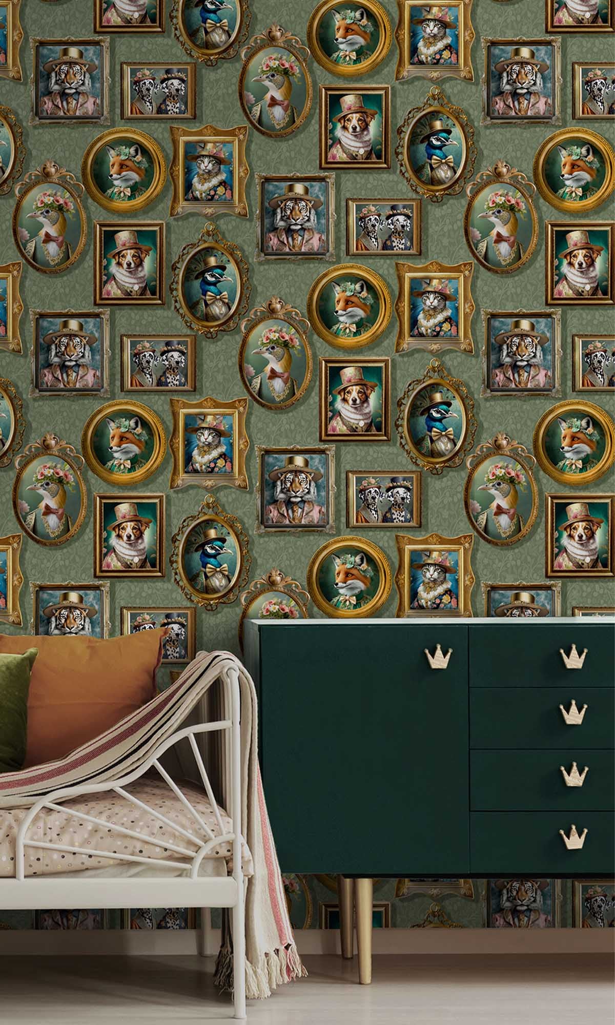 The Framed Regal Beasts Wallpaper is a work of art that transforms your room into a realm of regal wonder. Use it to create a statement wall that honors creativity, style, and narrative. This unique design, which features picture frames full of adorable animals wearing exquisite Victorian-era clothing, turns any space into a sophisticated gallery of imagination. From elegant foxes in evening gowns to dapper dogs in top hats, every portrait perfectly combines humor, fantasy, and sophistication.