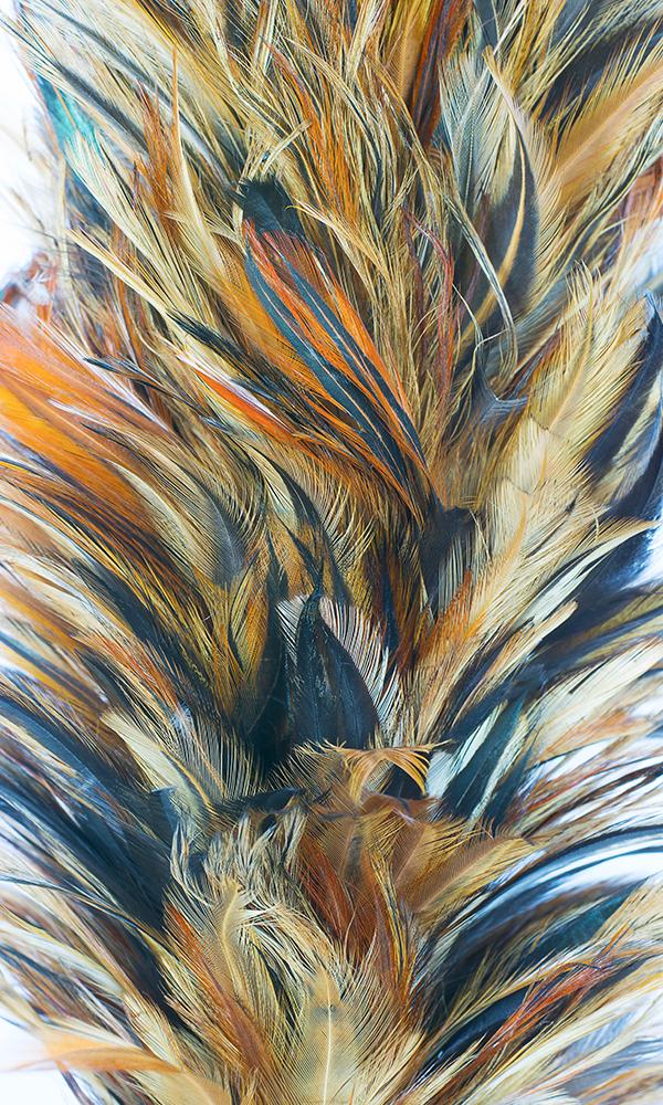 Elegant in its presentation, the eye-catching navy blue, gold, and orange weave together in this unique abstract digital mural. The striking colors of the feathers have a sophisticated appeal, and the high level of detail brings the imagery to life. The direction of the feathers gives this print the feeling of movement, bringing a new energy to the space.