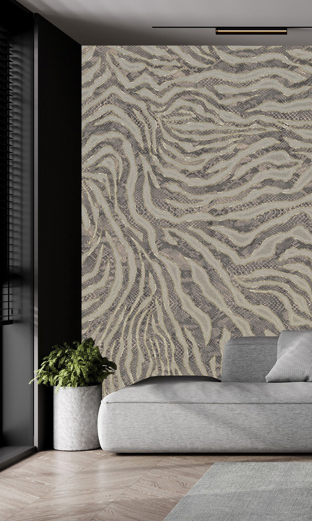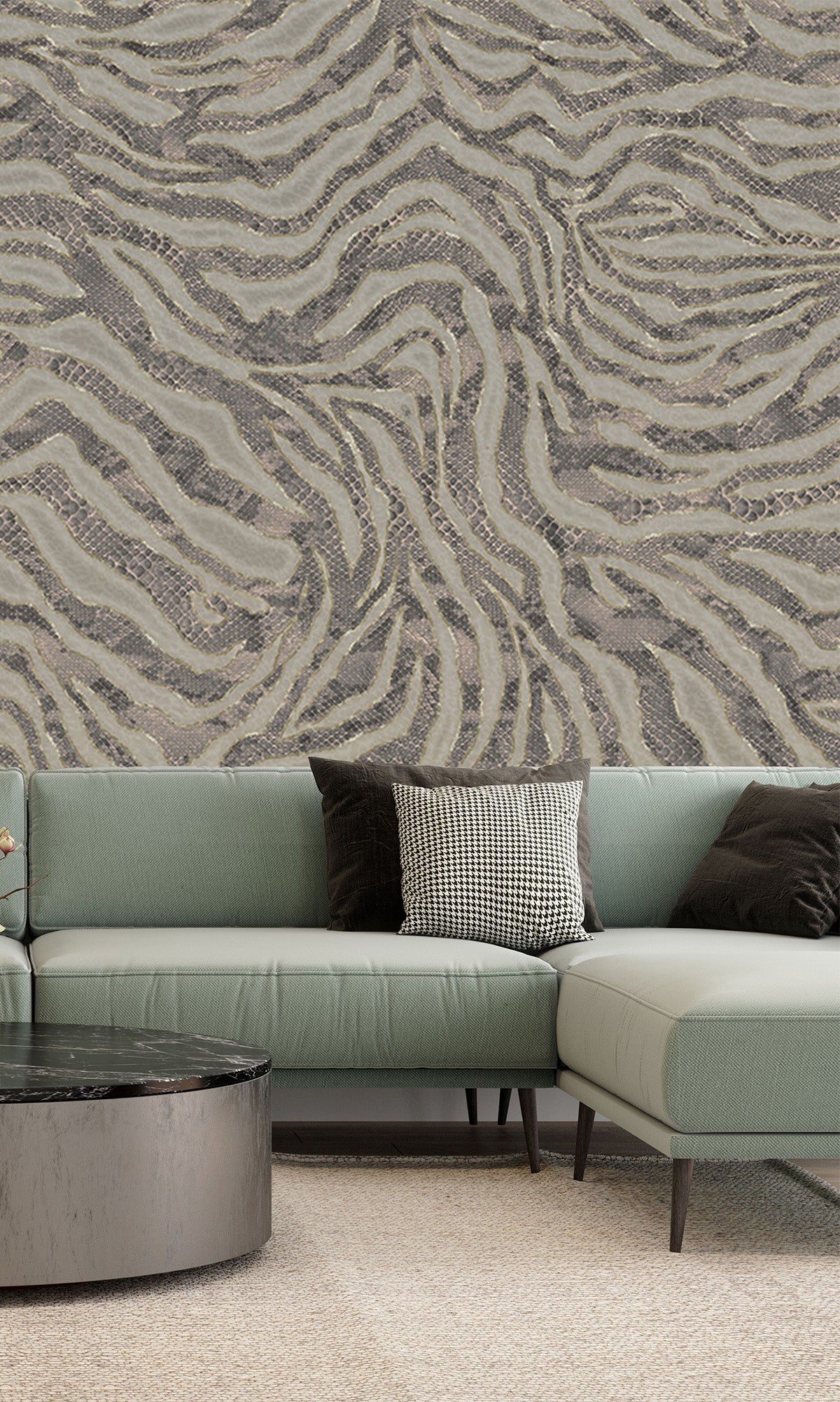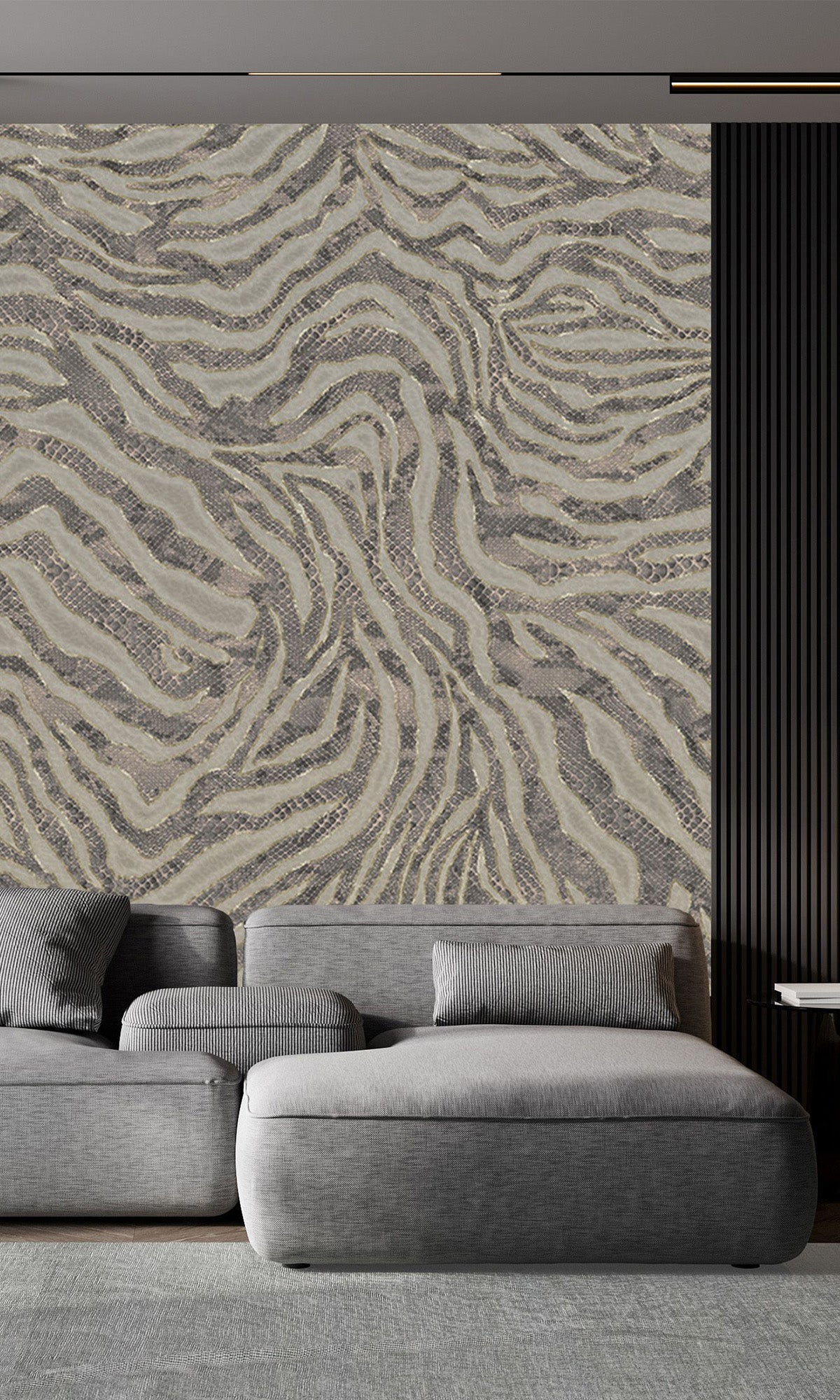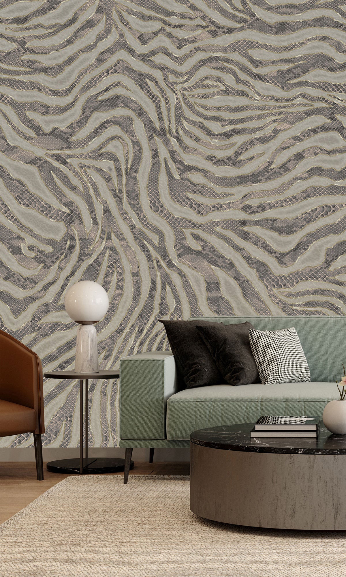 Embrace daring sophistication with our Muance Whispers Mural Wallpaper. This captivating design showcases an artistic interplay of textures, featuring a winding tree root beautifully crafted in a lifelike faux snakeskin pattern, resulting in a striking and balanced composition that draws the eye.